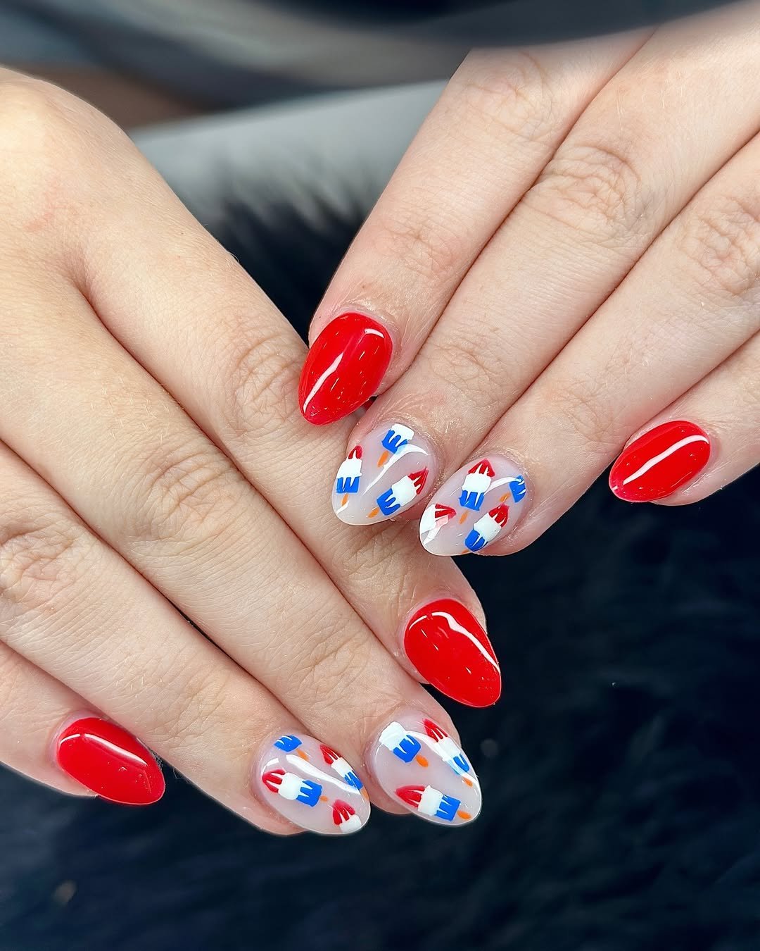 Bright red nails frame playful accent fingers covered in tiny red, white, and blue popsicles. It’s nostalgic in the best way, like sticky fingers and freezer treats on a hot afternoon.