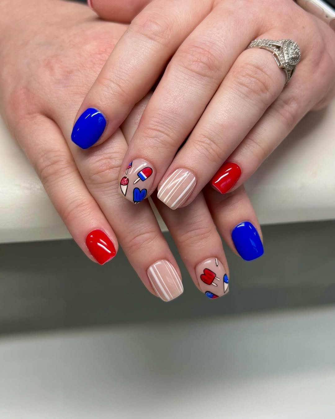 Bright cobalt and cherry red anchor this playful set, while nude accent nails feature tiny patriotic popsicles and striped details.