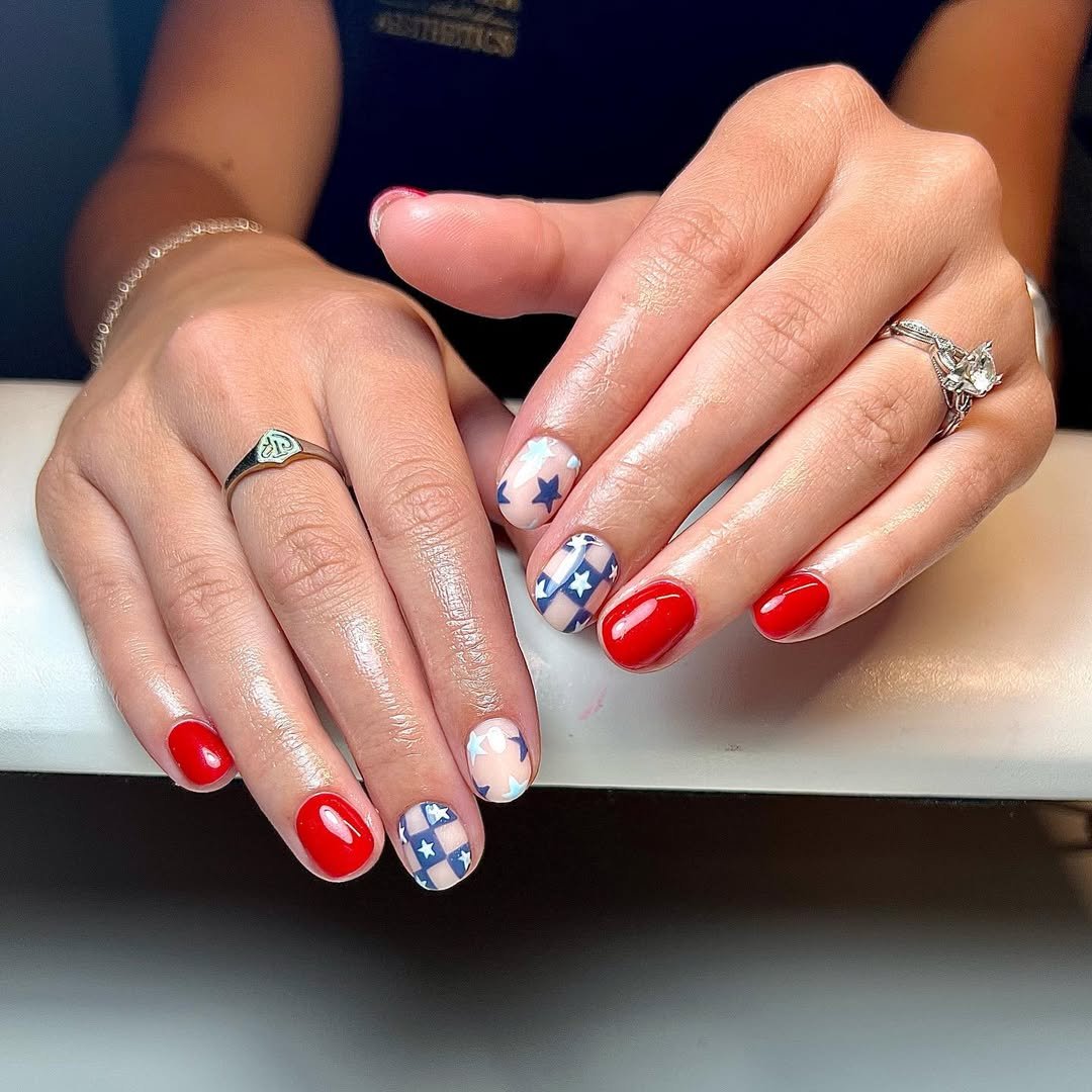 Classic bright red anchors the set, while accent nails play with sheer nude bases and layered blue and white stars. The short length keeps it neat and modern.