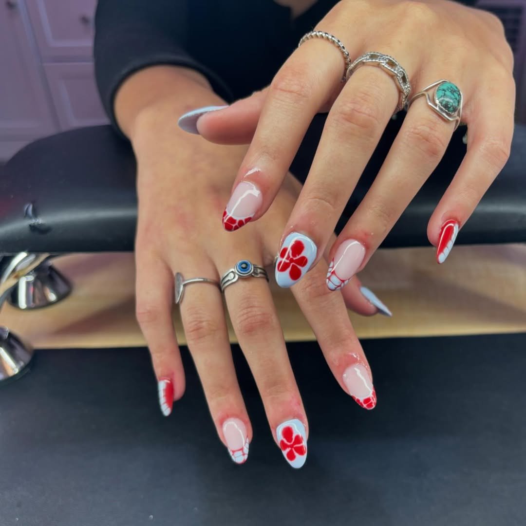 There’s something about mixing soft florals with patriotic red that feels so fresh. This set plays with glossy cherry tips, a pale blue accent, and delicate red blooms that almost look hand-pressed onto the nail.