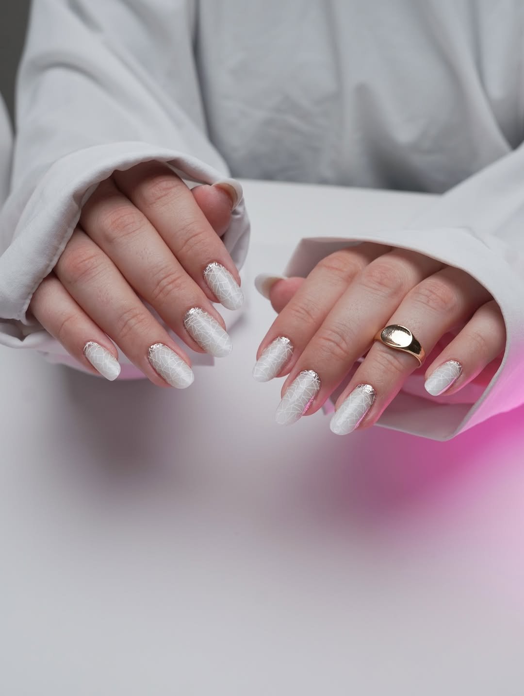 A little shimmer, a little texture, and a whole lot of bridal luxury. These nails mix wintery white with delicate embellishments that catch the light like tiny pearls. They look expensive — in that understated way that doesn’t need to announce itself.