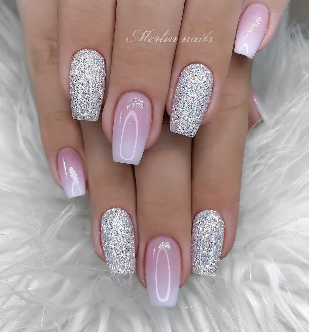 Talk about a grand finale—these nails sparkle like a whole celebration. The mix of milky ombré and full silver glitter makes this set feel luxurious, festive, and totally bridal-party ready.