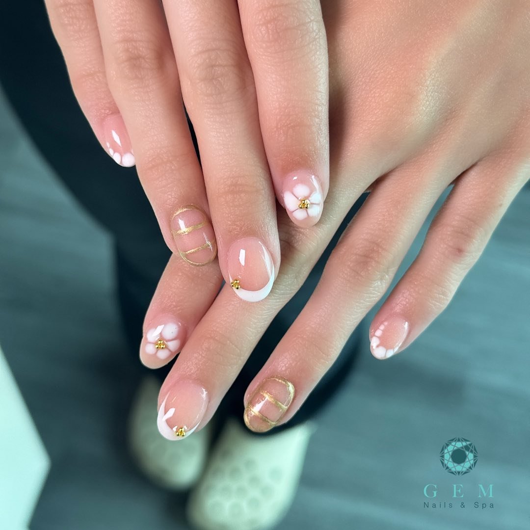 This one mixes dainty floral accents with chic gold lines—and the result is peak romantic energy. The milky base keeps things soft, while the touches of gold elevate it into something truly special.