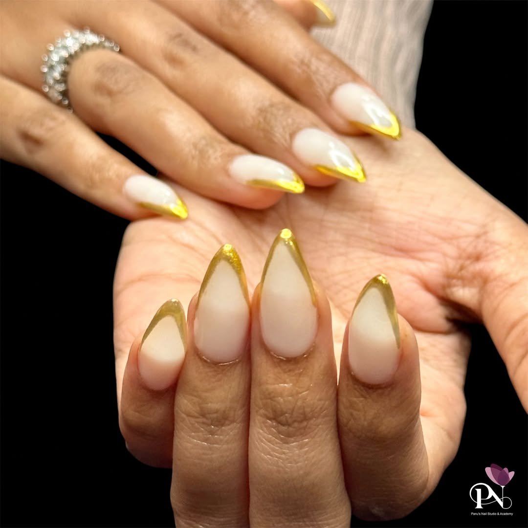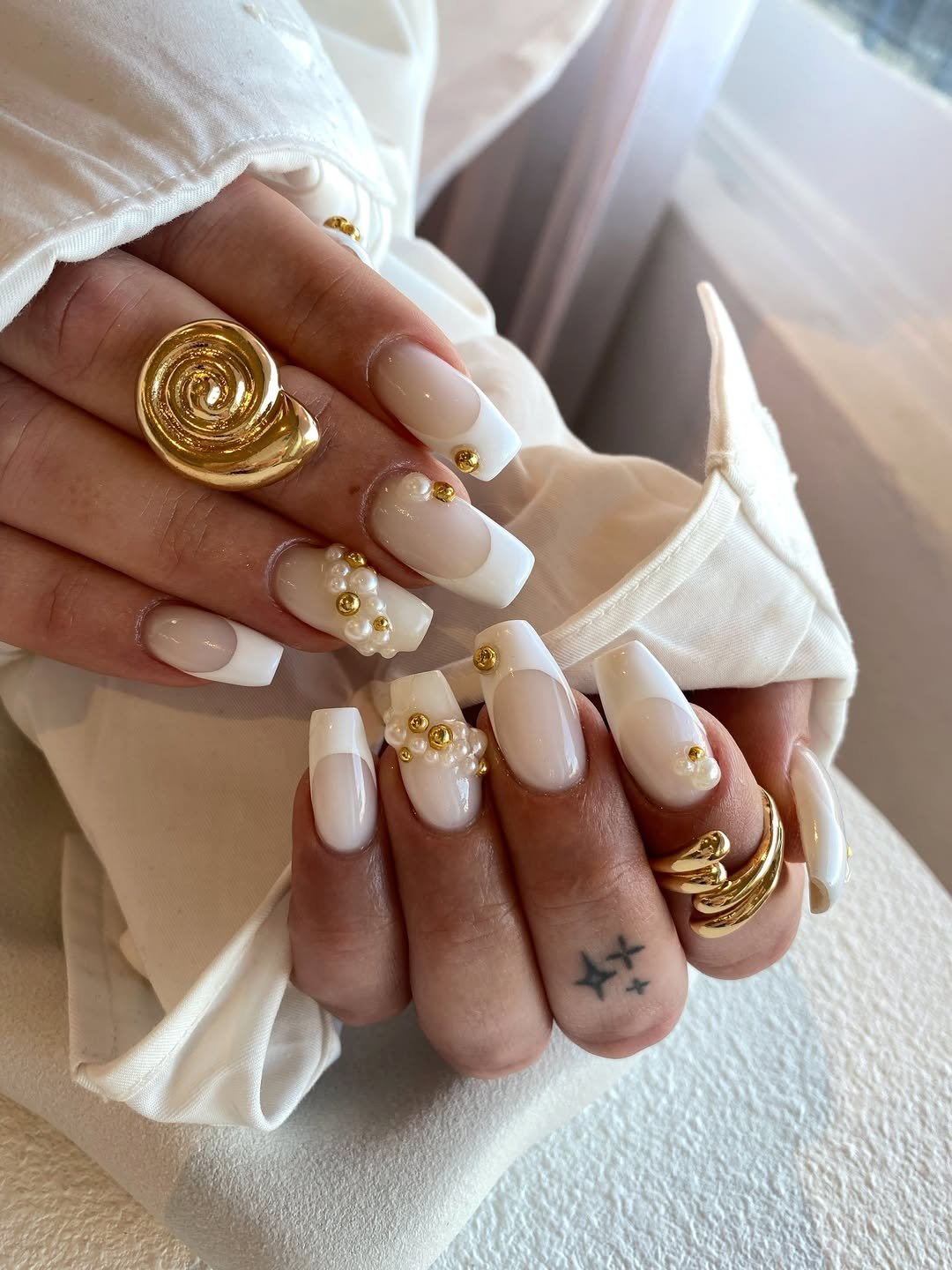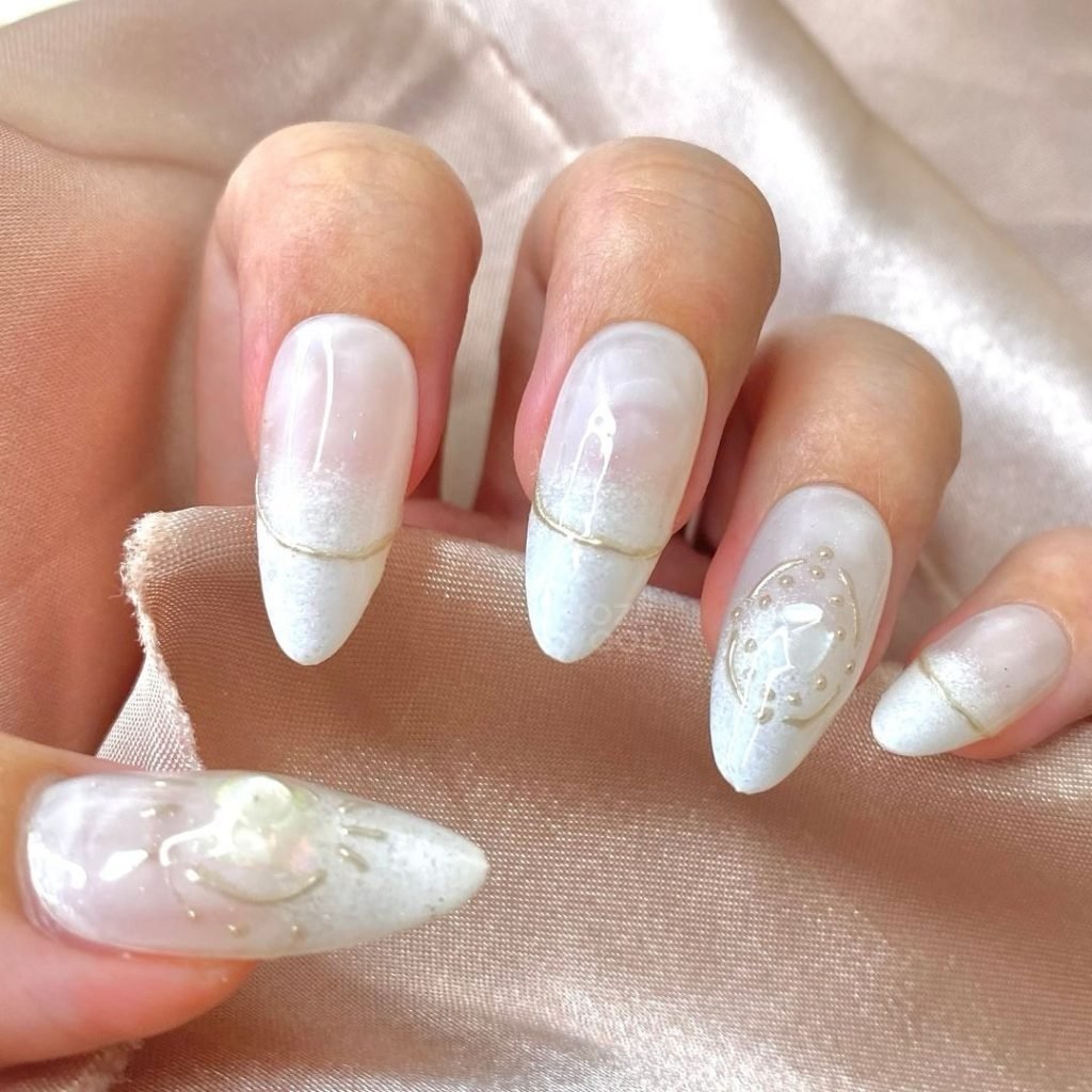 Talk about ethereal. These nails mix milky white gradients, soft gold lines, and delicate 3D accents that feel like petals frozen in glass. It’s subtle magic.