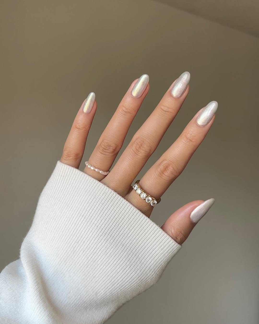 This one glows. Literally. The pearlescent finish has that ethereal, luminous sheen that moves with the light, giving your hands a soft halo effect. Pair it with gold or silver jewelry — it loves both.