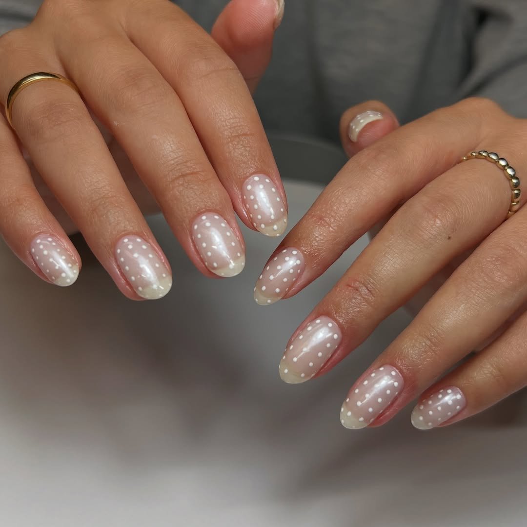 This set is basically the definition of bridal sweetness. A soft milky base, crisp almond French tips, and tiny pearl-like dots that feel dainty without being childish.