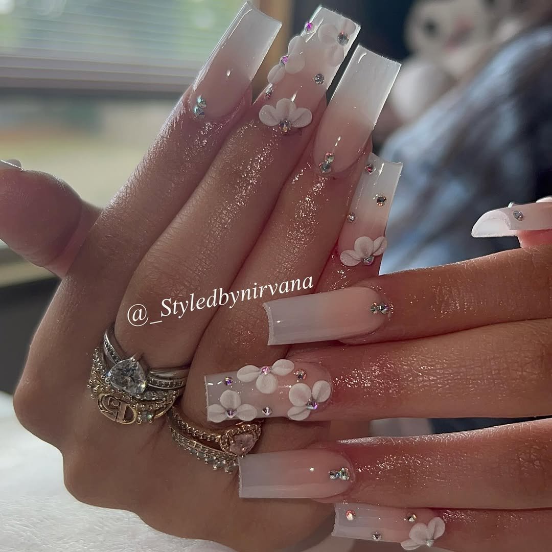 These nails are giving “fairy bride floats into her reception” energy, and honestly? We support it. The milky ombré base melts into those 3D floral petals like it was meant to be. Add in the tiny crystals catching the light and you’ve got a look that’s soft, dreamy, and extra—without being loud.