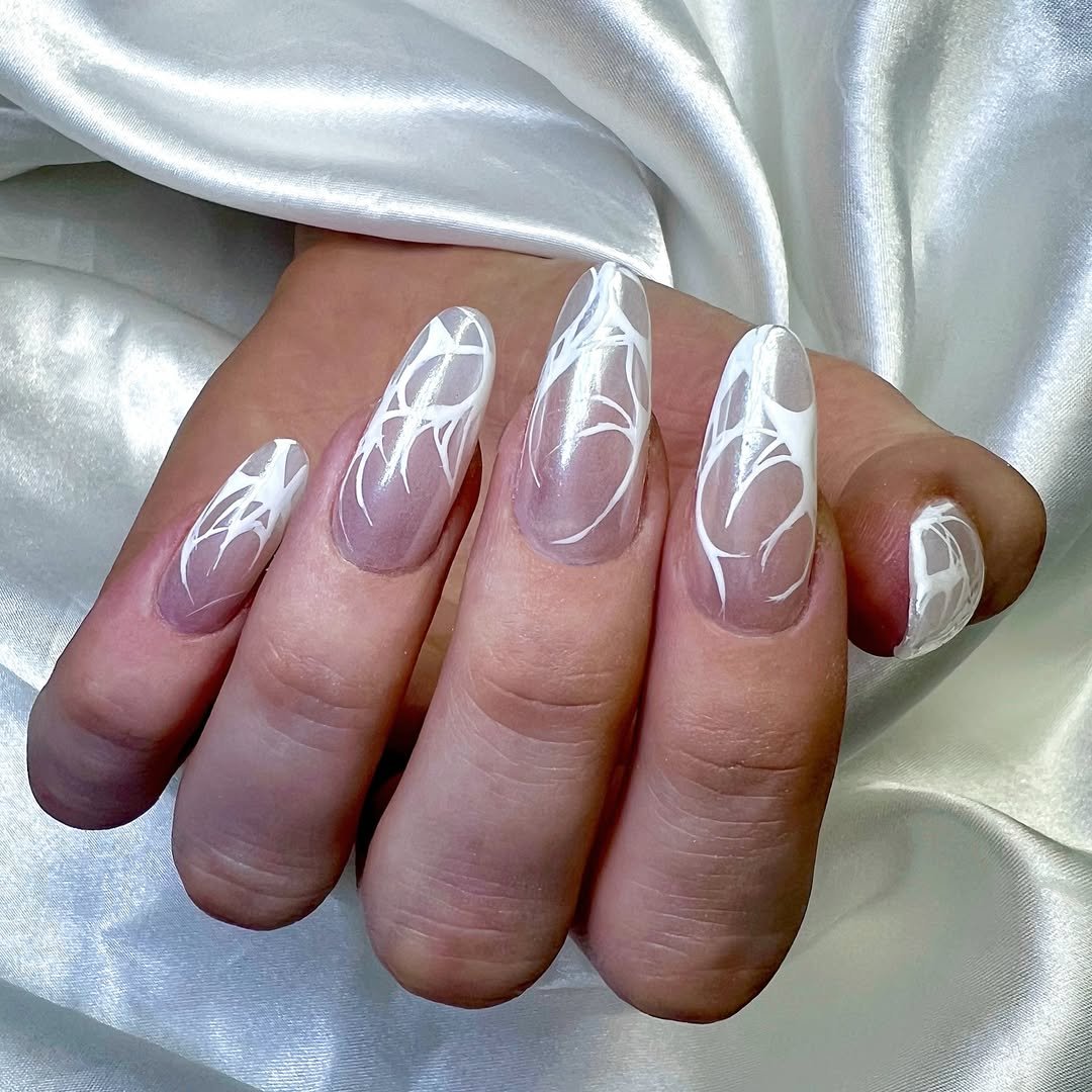 These abstract white swirls dance over a translucent milky base, giving the nails an ethereal, almost celestial look. It’s artsy, airy, and a total standout without stepping outside the bridal palette.