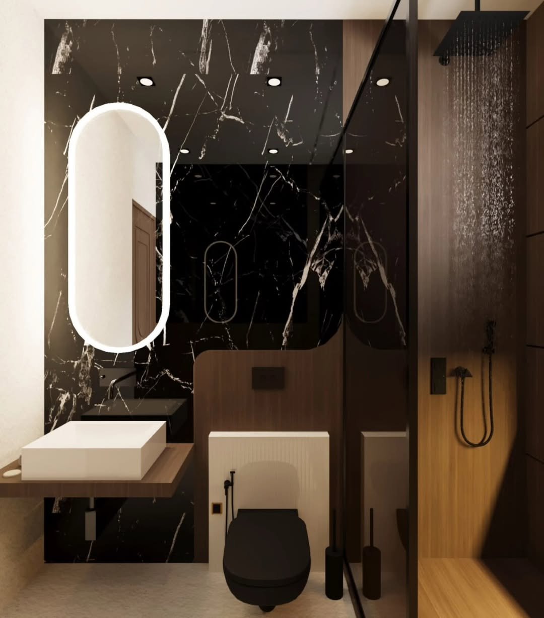 This is minimalism with attitude. The black marble backdrop instantly elevates the space, while the clean lines and warm wood tones keep it grounded.