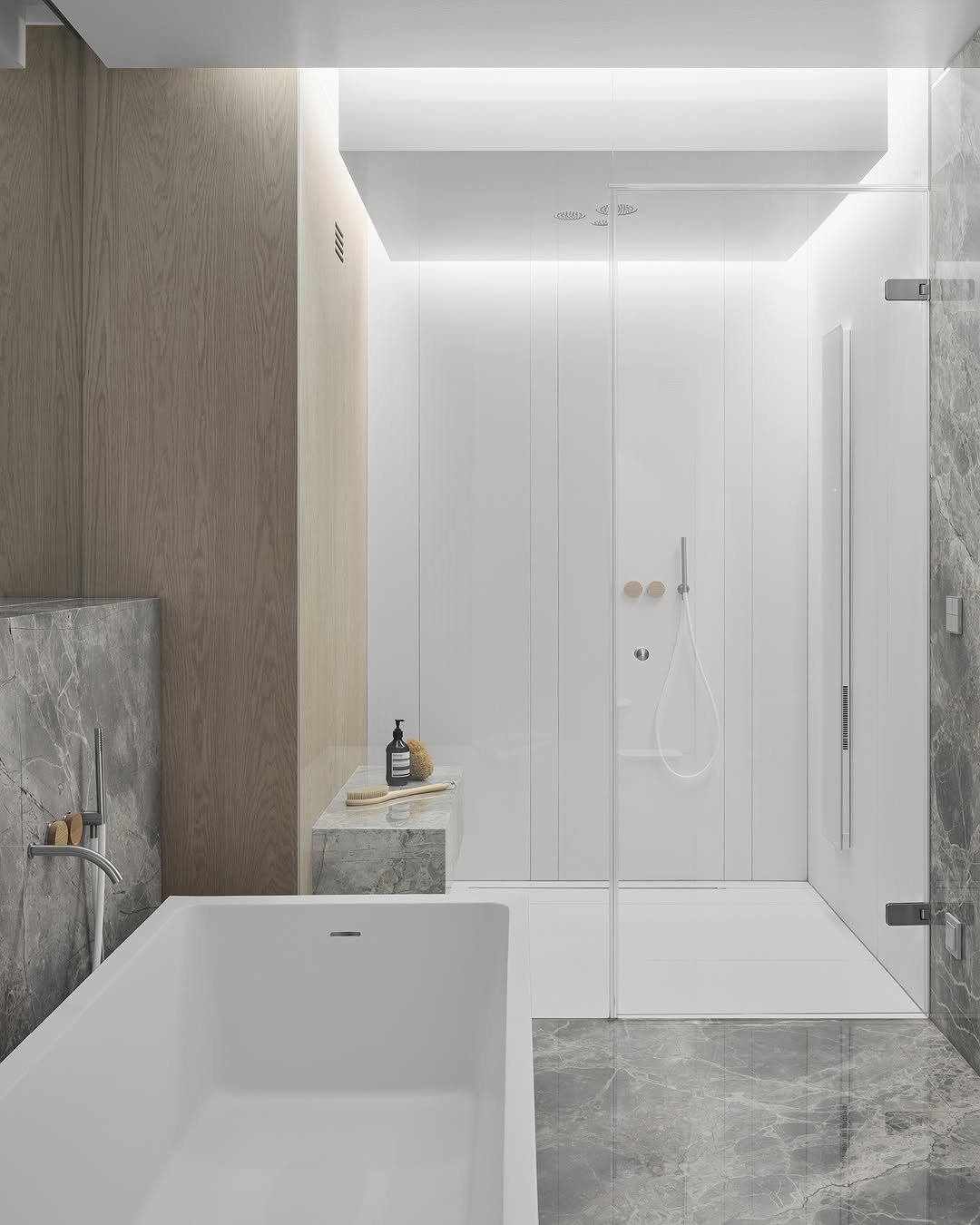 This space feels polished but relaxed. The mix of marble textures, soft lighting, and glass partitions keeps everything feeling open and seamless.