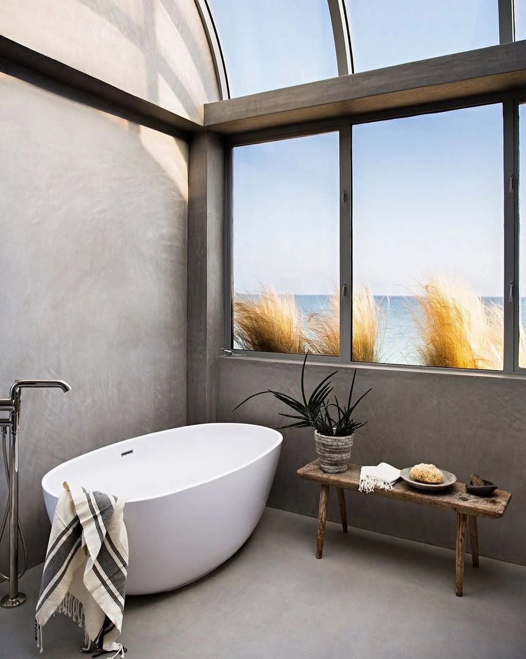Natural light steals the show here. The soft concrete tones, simple tub, and that ocean view create a space that feels calm and expansive.