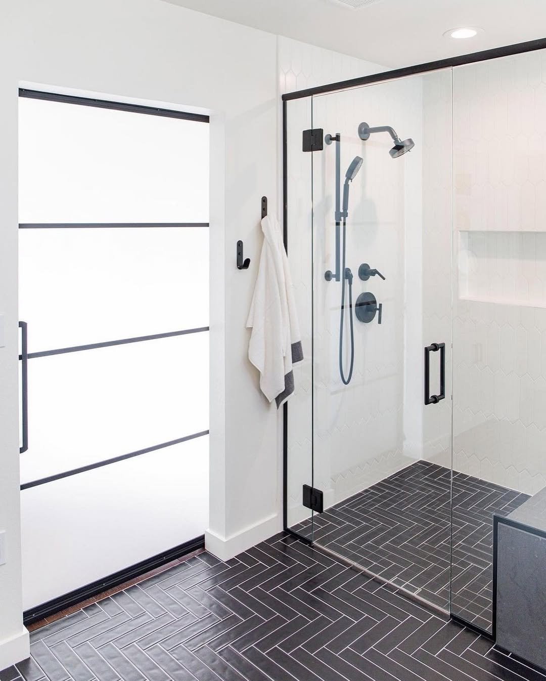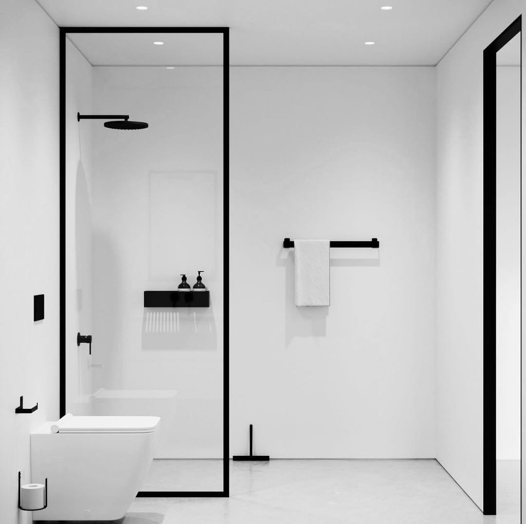 Clean, crisp, and almost architectural. The black-framed glass and all-white palette create a look that’s striking without needing anything extra.