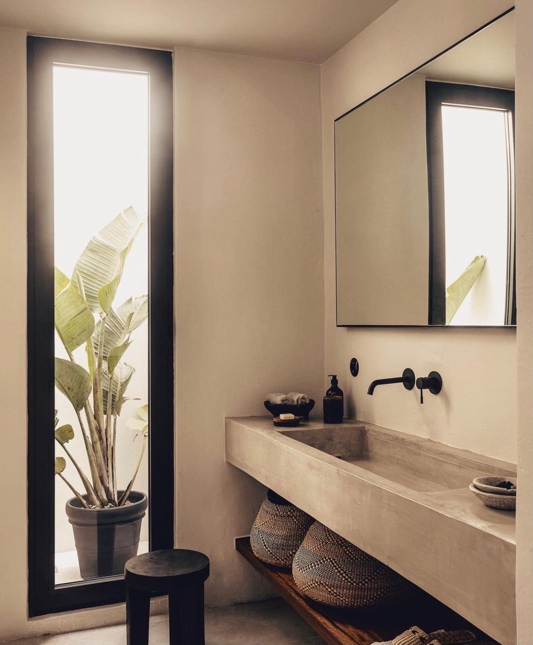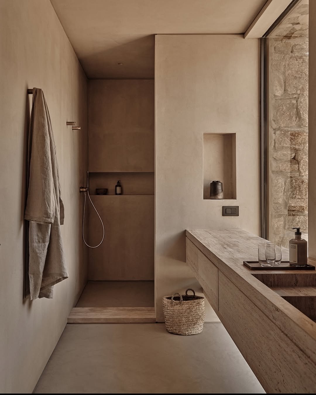 There’s something really calming about this setup. The concrete sink, neutral tones, and soft lighting make it feel grounded and intentional.