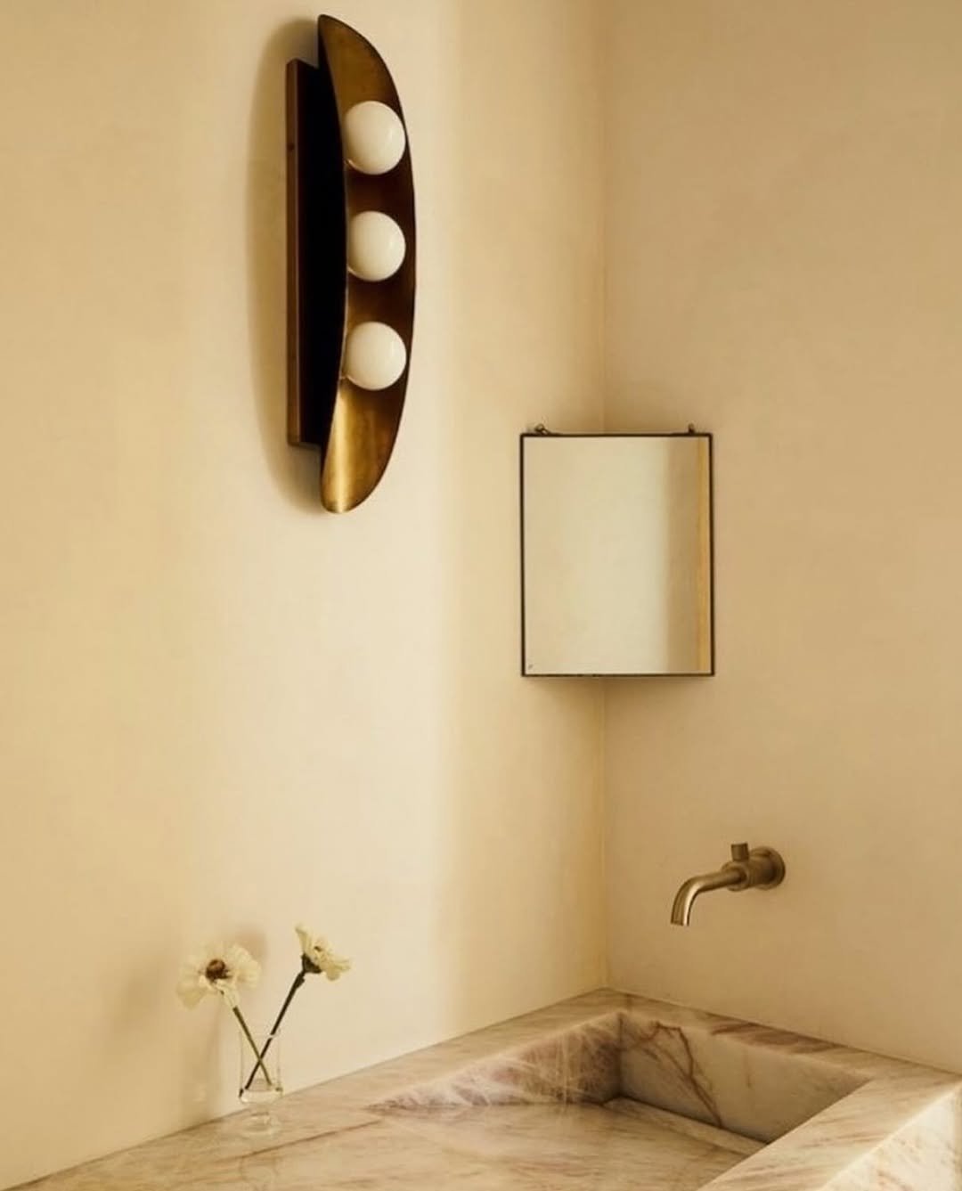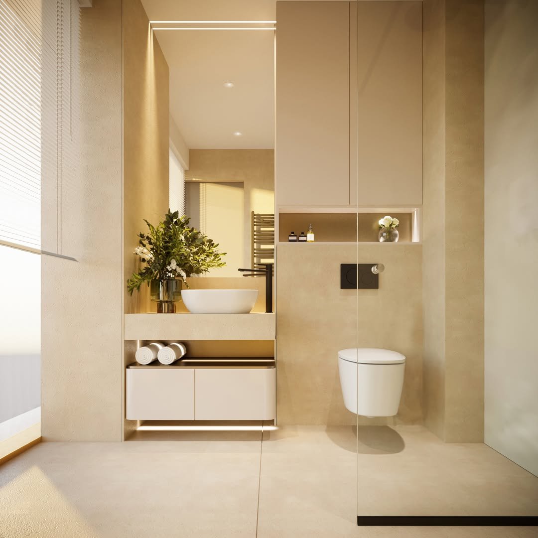 This one feels like a soft exhale. The warm beige tones, simple sink setup, and minimal decor create a space that’s calm and almost meditative.