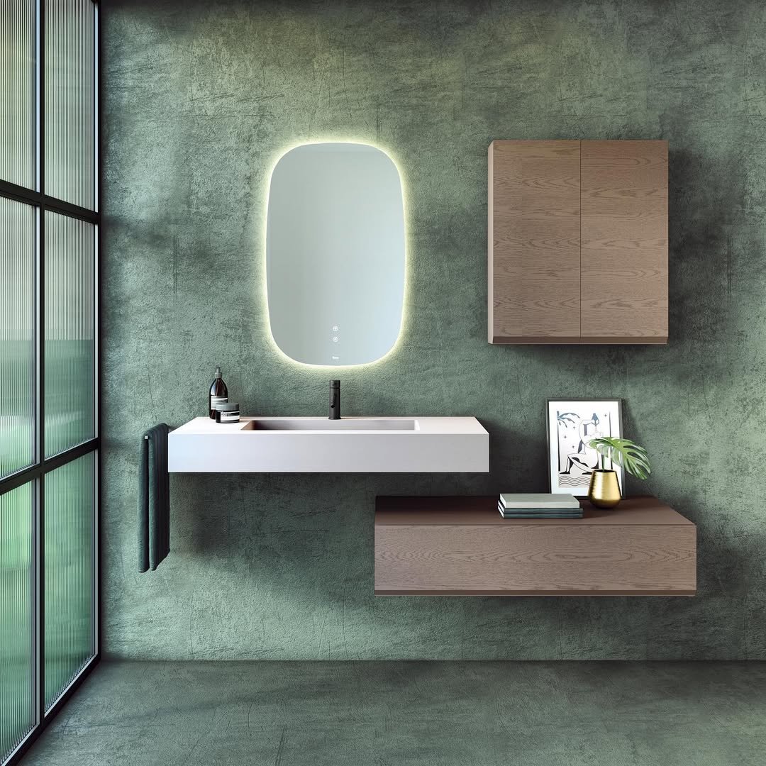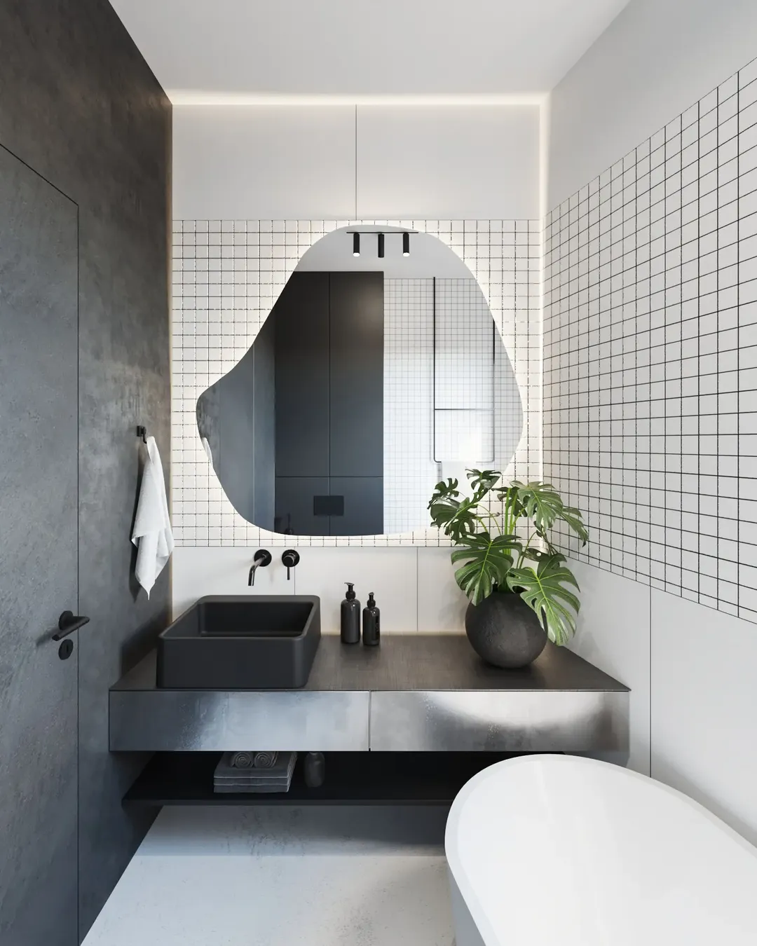 This one hits that sweet spot between minimal and bold. The grid tiles bring structure, while the organic mirror shape softens everything just enough to keep it from feeling too rigid.