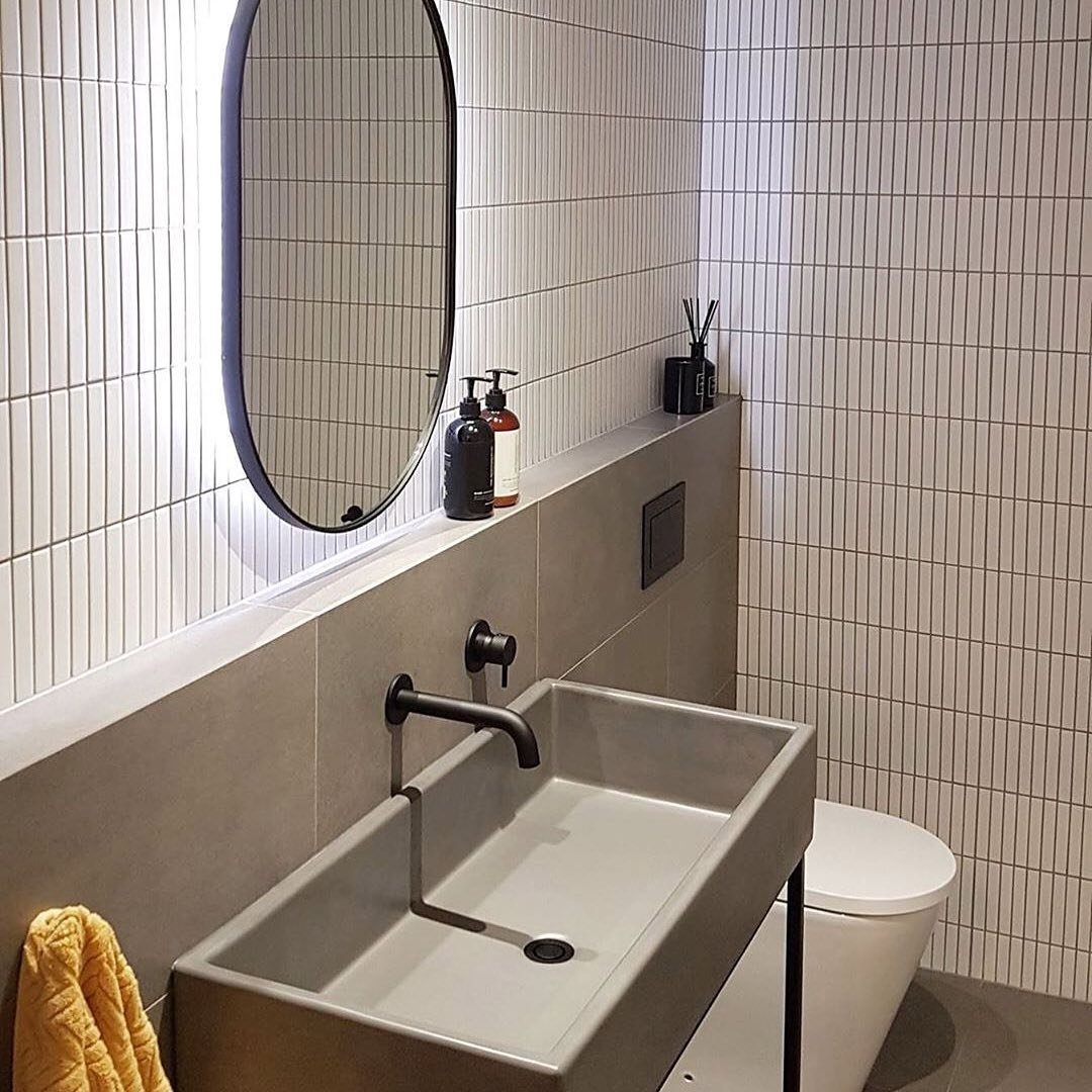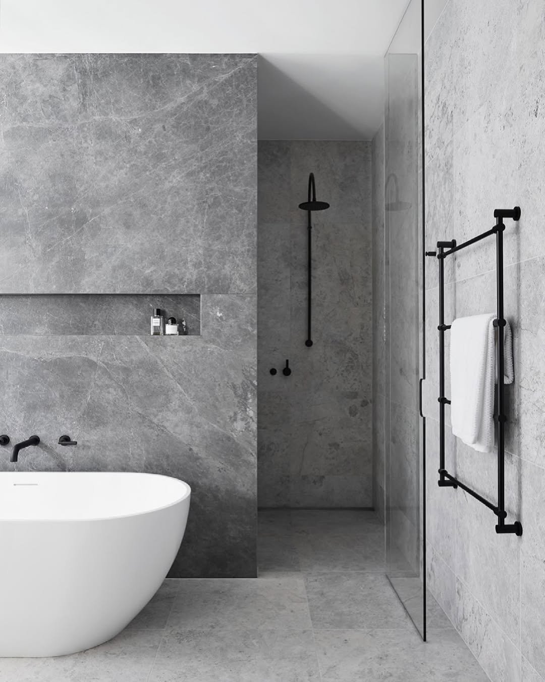 This one leans into that calm, tonal palette—and it nails it. The layered greys paired with matte black fixtures create a look that’s both modern and soothing.