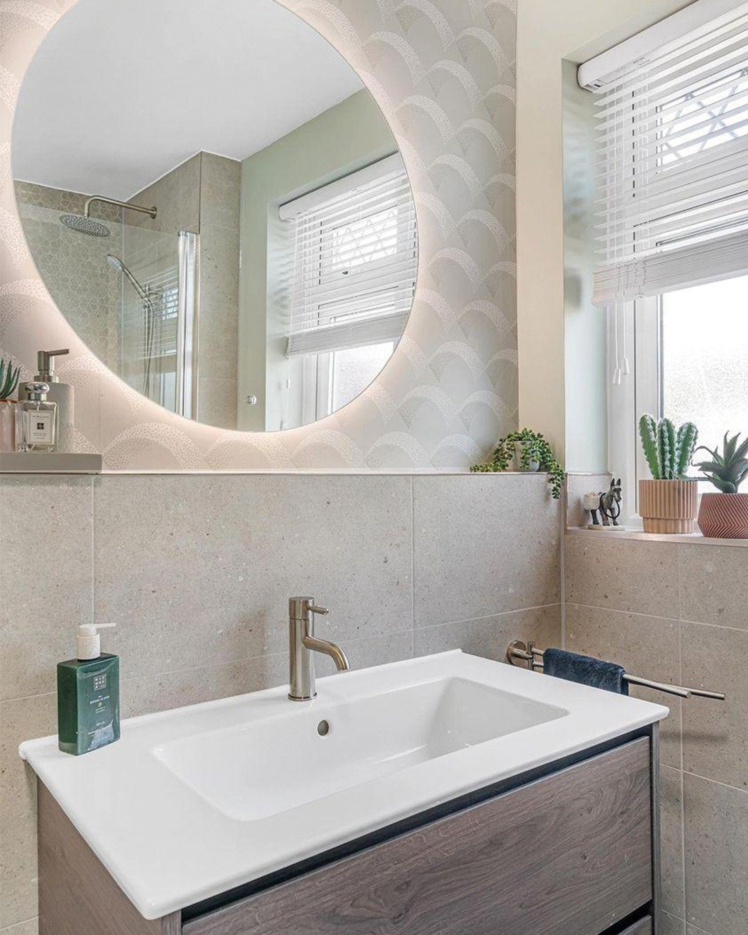 This space plays with subtle detail in the best way. The textured wall pattern and round mirror add visual interest without overwhelming the design.