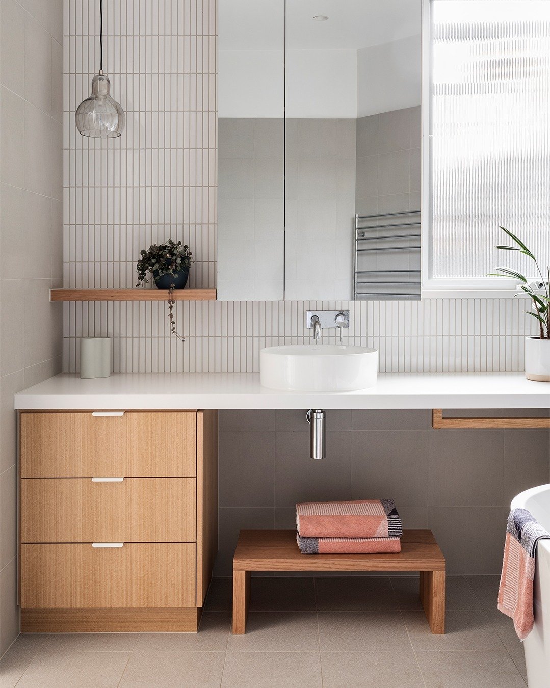 This space feels like a breath of fresh air. Pale wood, soft neutrals, and those vertical tiles create a calm rhythm that’s easy on the eyes.