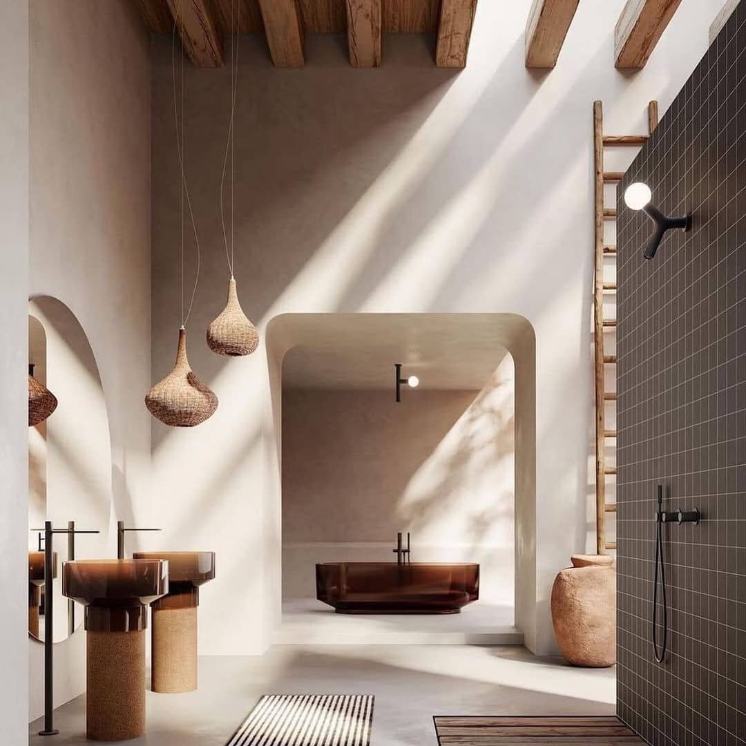 This one is pure atmosphere. The natural light, soft arches, and earthy tones create a space that feels both minimal and soulful.