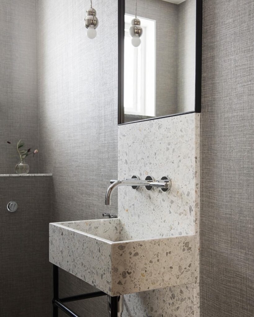 This is where texture takes the lead. The terrazzo-style sink and subtle wall finishes add depth without needing bold colors or patterns.