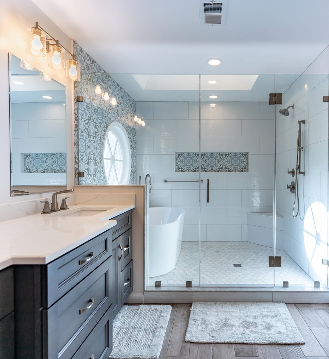 Everything here feels open, airy, and super clean. The glass shower makes the whole bathroom feel bigger, while the soft blue-gray tones keep it calm and easy on the eyes.