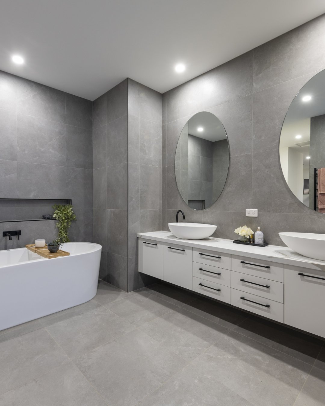 This space leans into simplicity, but in a really refined way. The grey palette, double vanity, and soft lighting create a clean, hotel-like feel that’s both practical and relaxing.