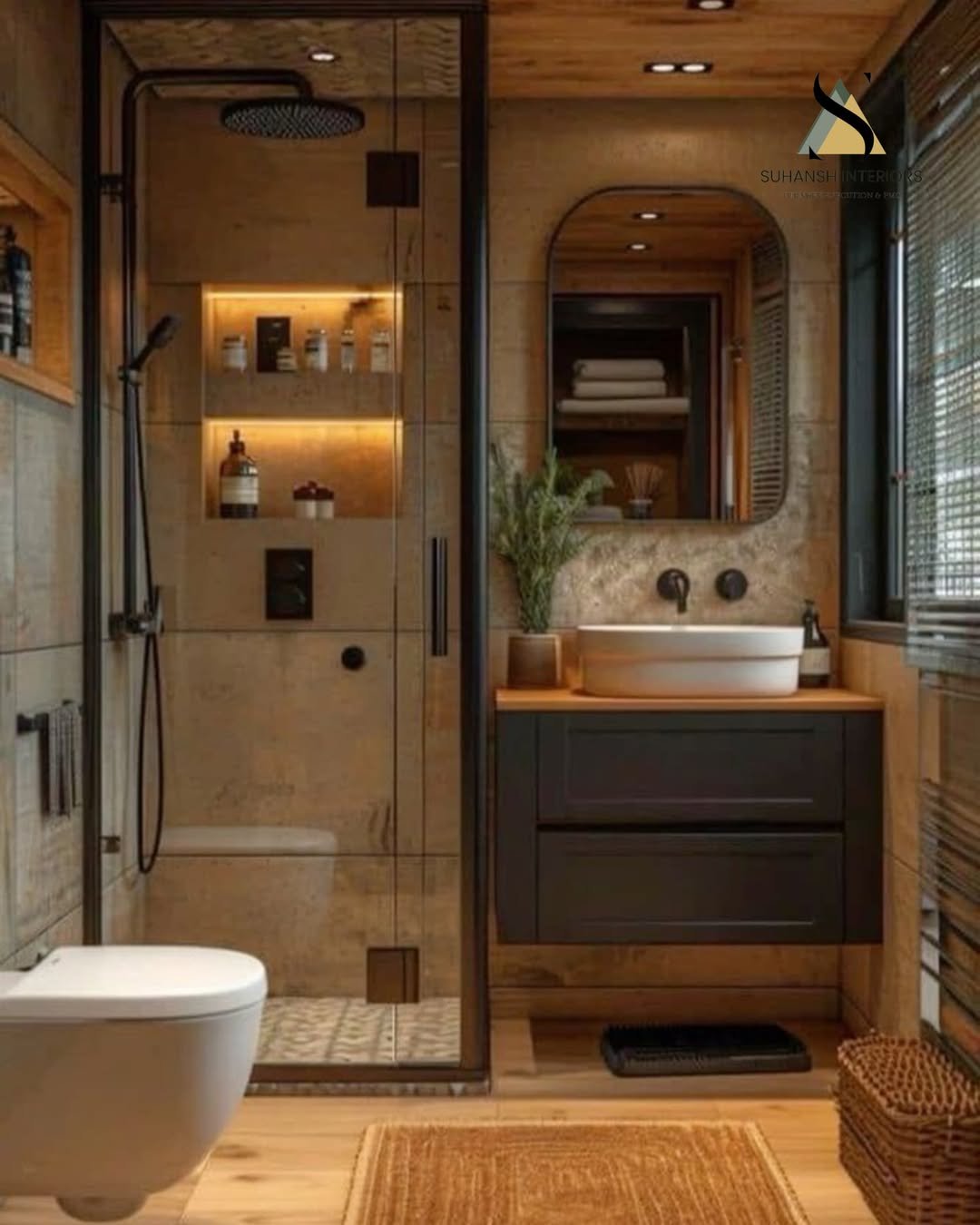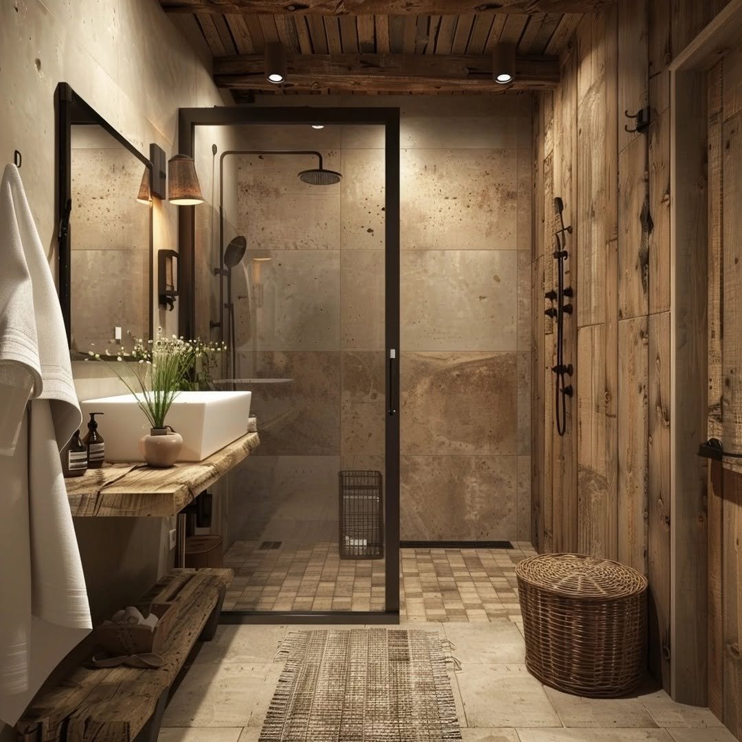 This one brings in a completely different energy with its darker tones and raw textures. The wood vanity feels rugged and grounded, while the glass shower keeps things modern and open.