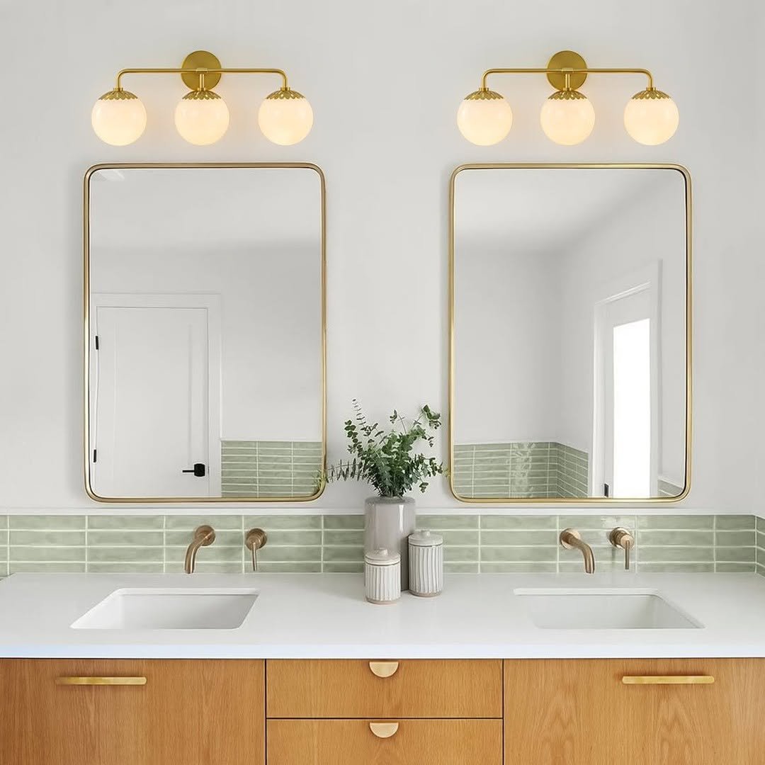 This setup feels bright, fresh, and super polished. The double mirrors with soft globe lighting create symmetry that instantly makes the space feel organized and elevated.
