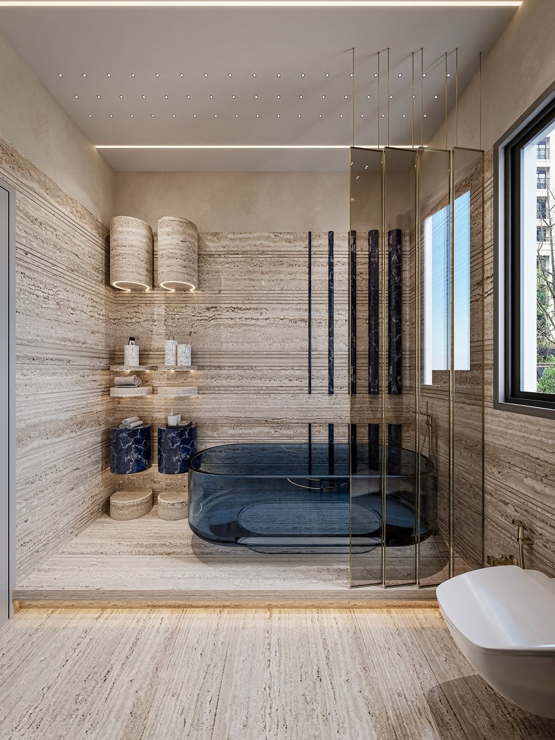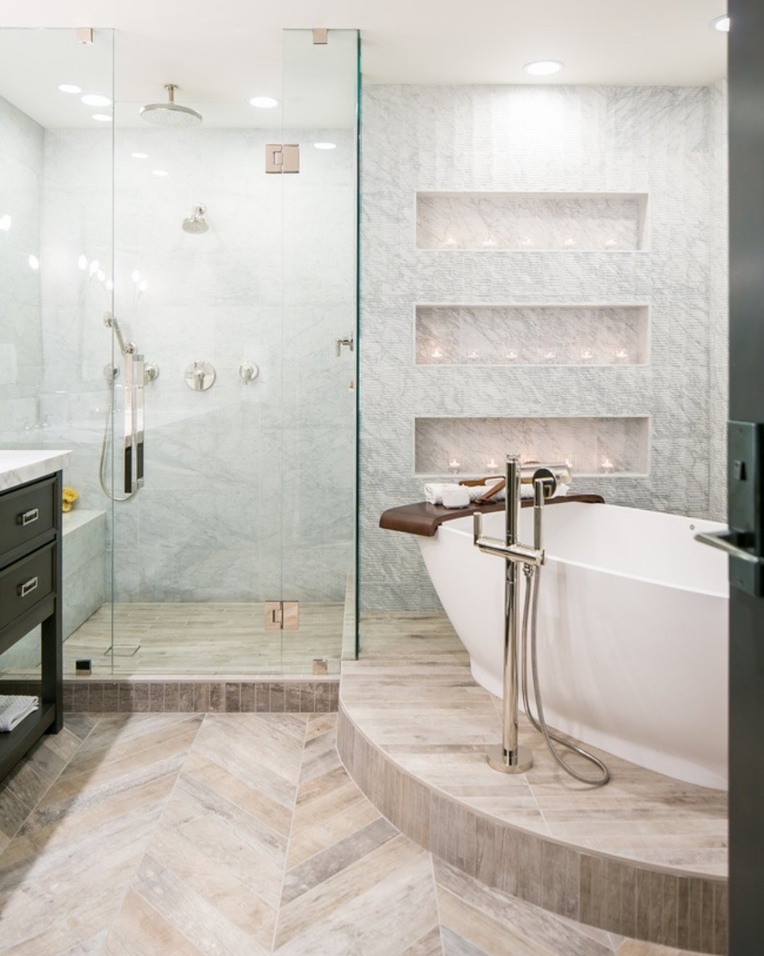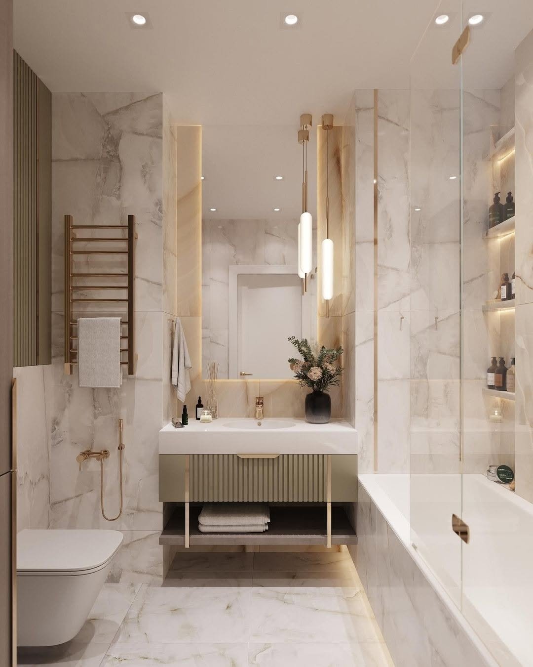 This one instantly feels high-end the moment you look at it. The built-in wall niches with soft lighting create such a calm, spa-like atmosphere—it’s all about those quiet luxury details.