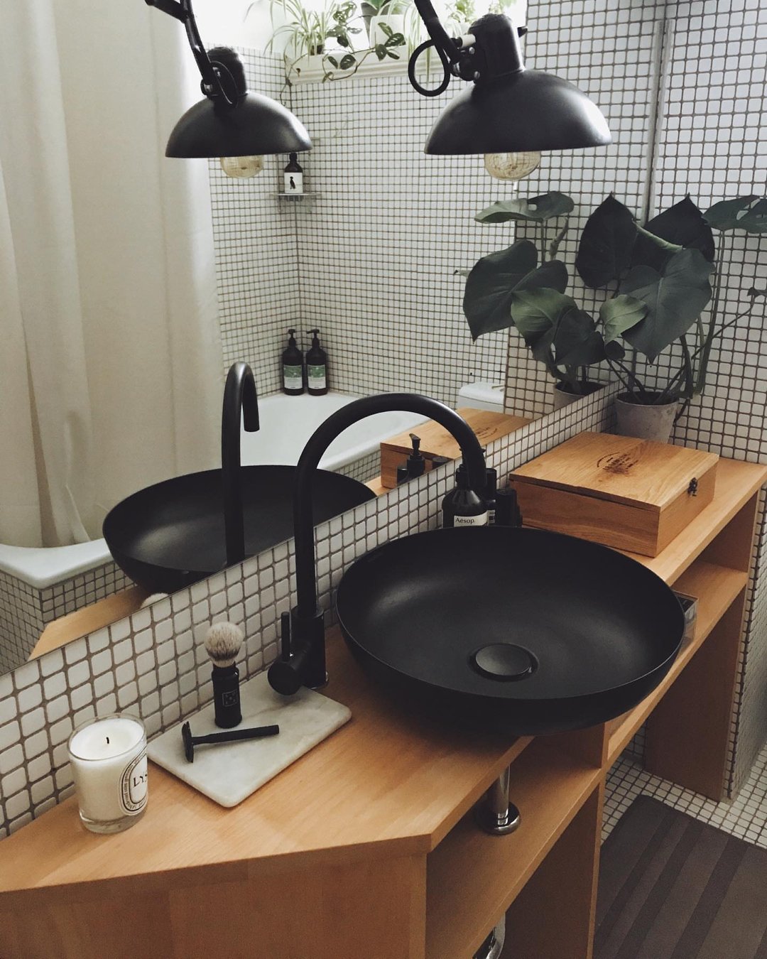There’s something about matte black sinks and fixtures that instantly makes a space feel elevated. Paired with those tiny grid tiles and soft wood shelving, this setup hits that perfect balance between minimal and bold.
