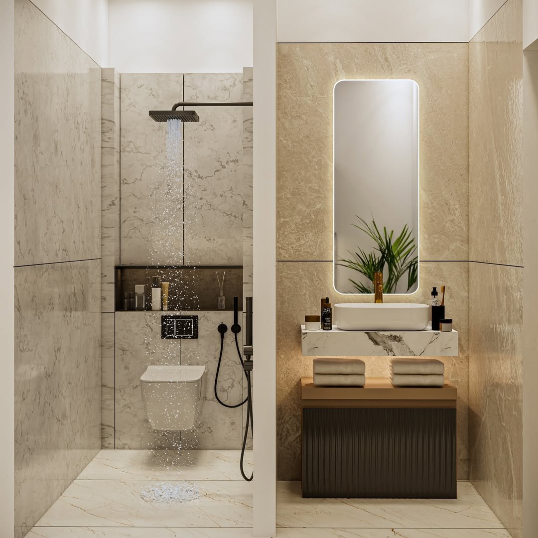 This one feels like pure luxury wrapped in warm tones. The marble veining paired with soft wood cabinetry and hidden lighting creates that smooth, high-end flow that just feels expensive without being loud.