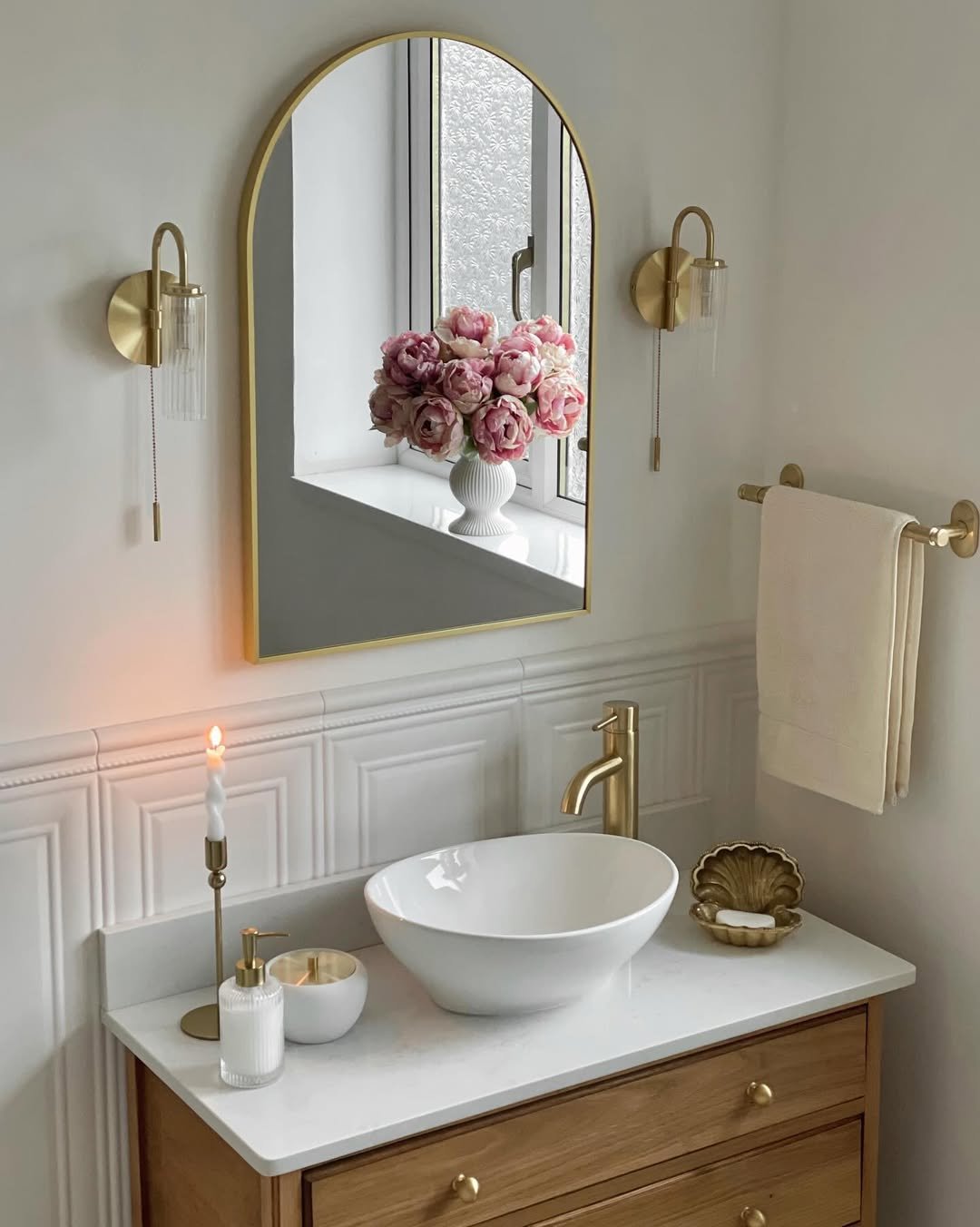 This setup feels delicate without being overly styled. The soft tones, gold fixtures, and that curved mirror create such a gentle, calming aesthetic—almost like a quiet morning routine captured in design form.