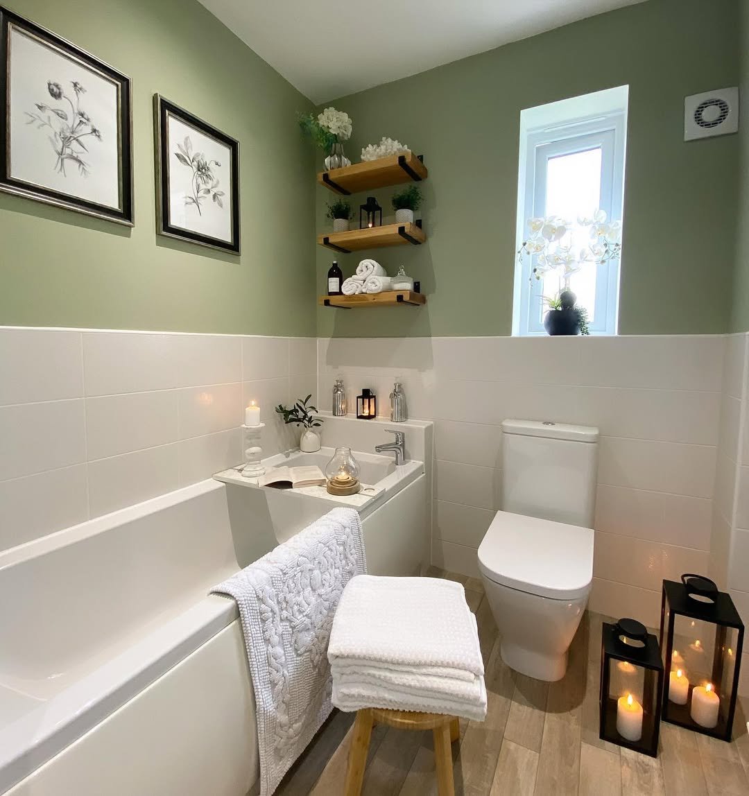 This one feels fresh in the most subtle way. The muted sage green vanity paired with those patterned floor tiles creates just enough visual interest without overwhelming the space.