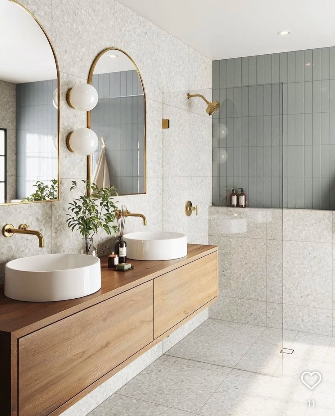 It’s the kind of bathroom that doesn’t try too hard, yet everything looks perfectly placed. The muted green shower tiles in the background quietly add contrast without stealing the show. Clean, airy, and effortlessly elevated.