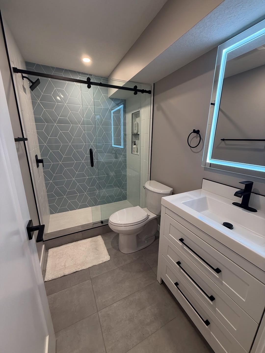 Small space, but everything feels sharp and intentional. The geometric tile in the shower paired with LED mirror lighting gives it that clean, updated look.