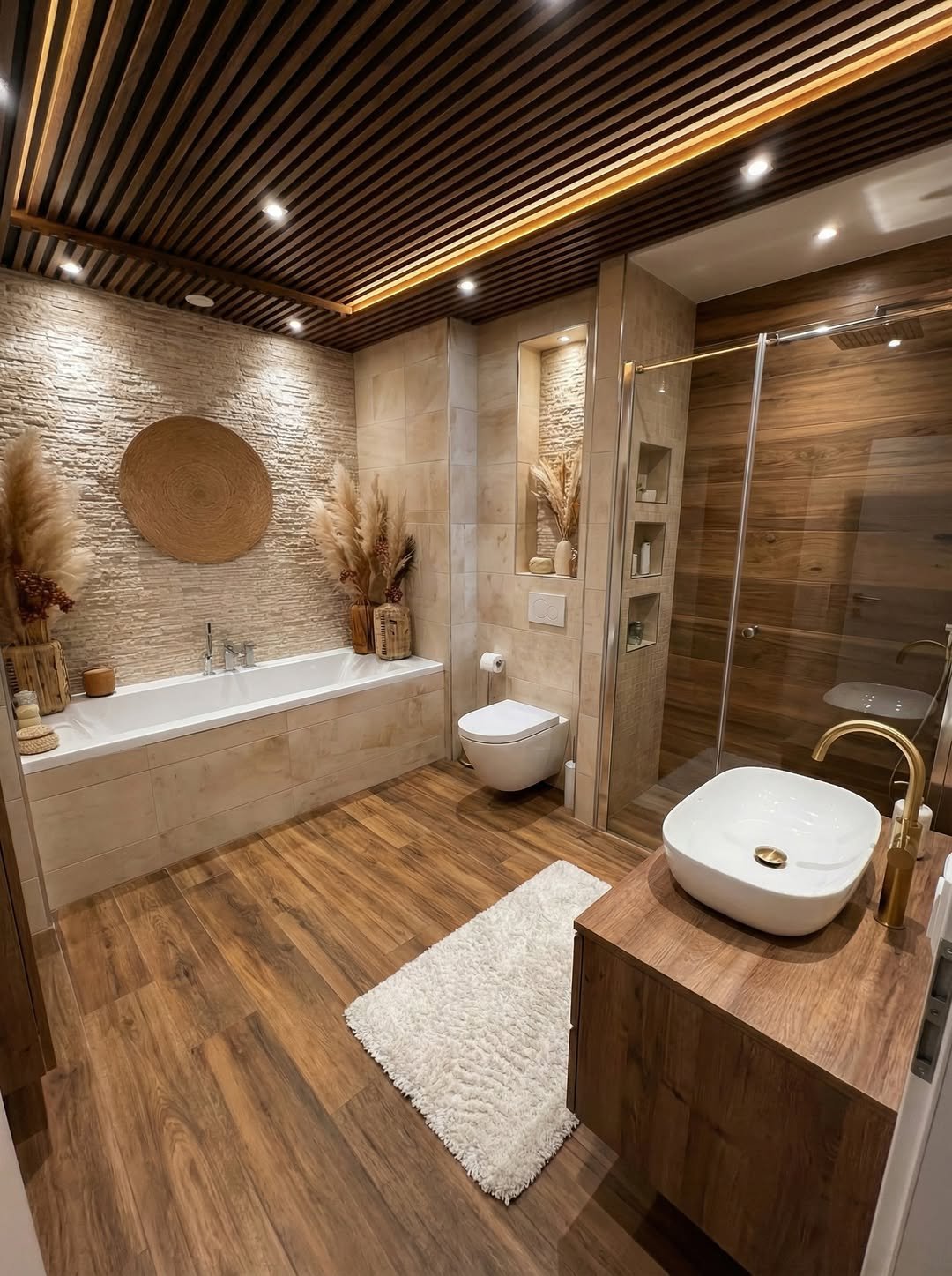 This one feels like a full-on spa experience at home. The wood textures, soft lighting, and natural tones create a calm, relaxing environment that feels designed to unwind.