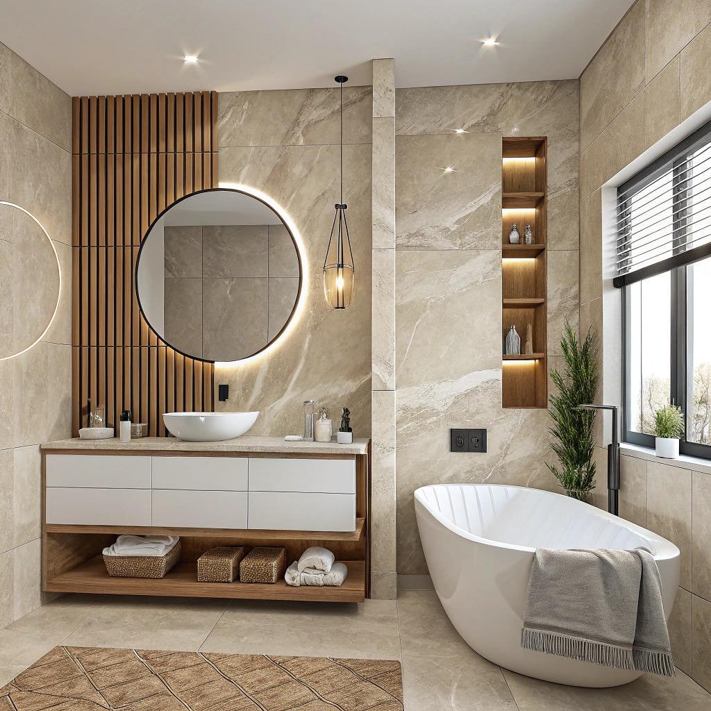 This one hits that sweet spot between minimal and cozy. Neutral tiles, clean lines, and a floating vanity keep things modern, while the round mirror and wood slats bring in a softer, more approachable feel.