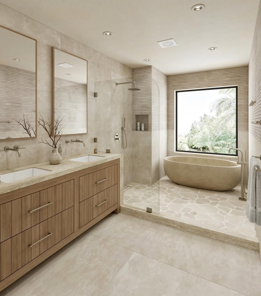 Everything here feels light, open, and just… easy. The soft beige palette, natural wood vanity, and that big window pulling in daylight make the whole space feel almost like a quiet retreat by the coast.