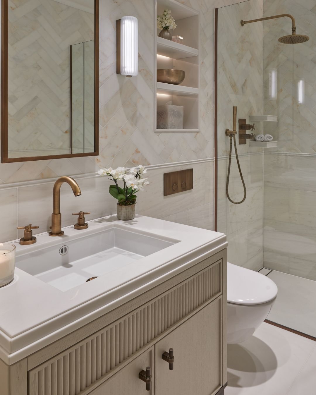 There’s something quietly luxurious about this one. The marble tiles, soft brass fixtures, and that elegant vanity detailing all come together in a way that feels timeless but still fresh. It’s not overly ornate, but you can tell every detail was chosen with care.