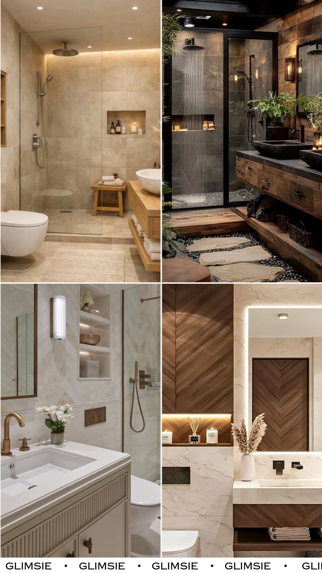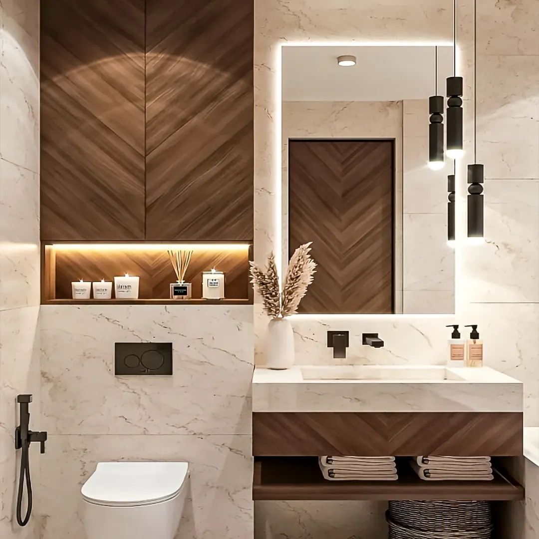This one is all about mood. The soft backlighting, natural stone textures, and warm tones create a space that feels incredibly calming—almost like a private spa tucked inside your home.