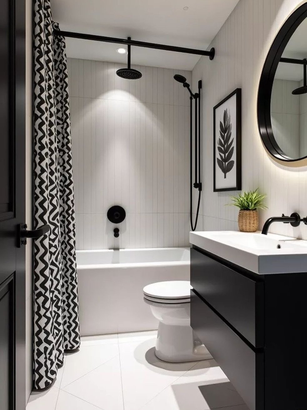This one’s bold without being loud. Black fixtures, clean white surfaces, and that patterned shower curtain bring in just enough contrast to keep things interesting. It’s modern with a slightly playful twist.
