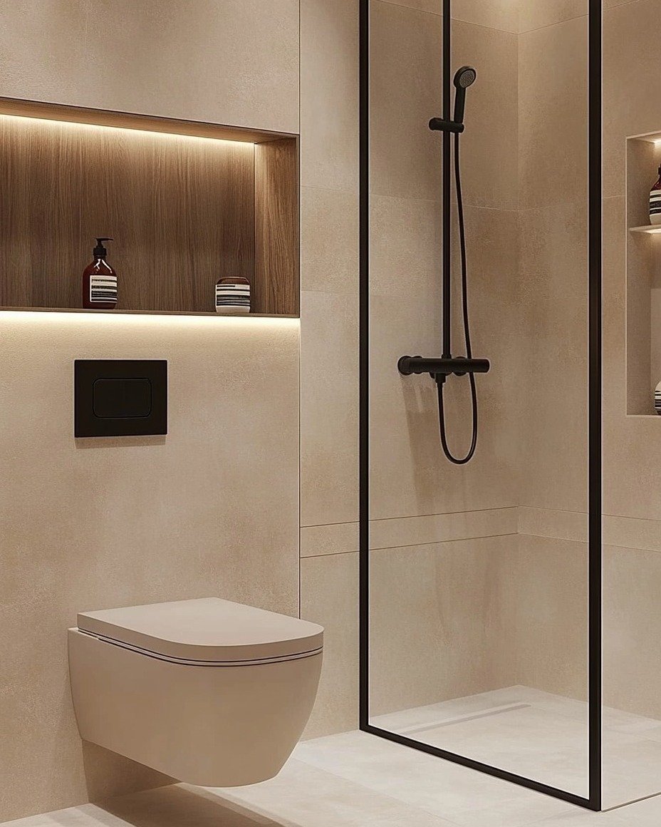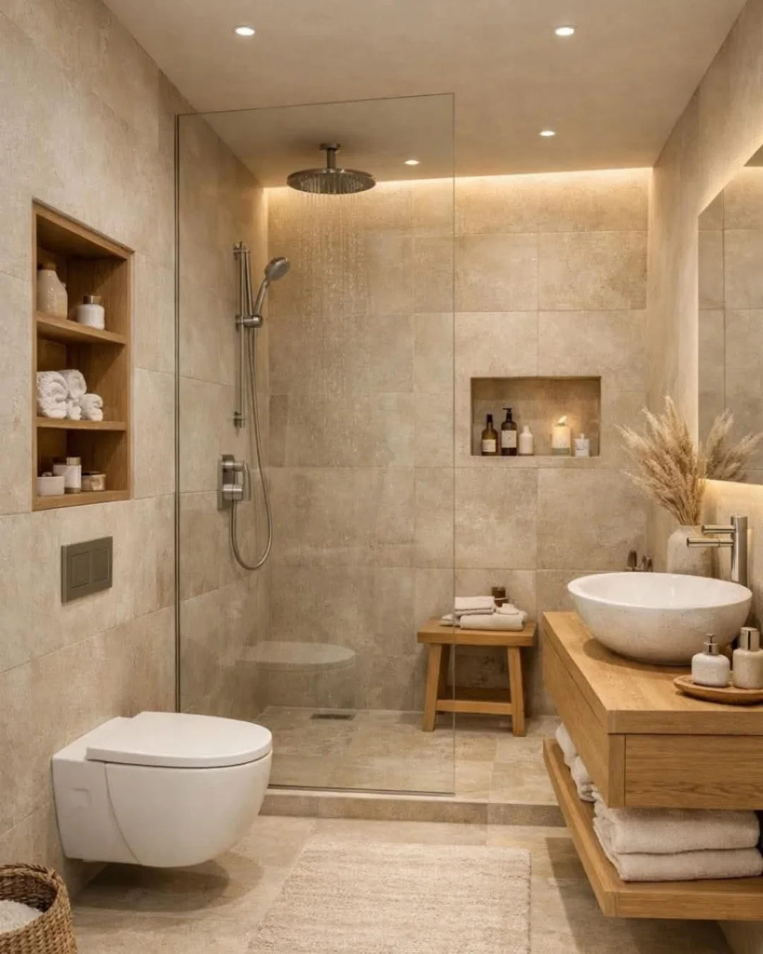 This bathroom feels like stepping into a calm exhale. Warm beige tiles wrap the entire space, creating that seamless, cocoon-like vibe, while the floating wooden vanity adds just the right touch of organic warmth. The open glass shower keeps everything visually light, and those built-in niches? Clean, practical, and quietly stylish.