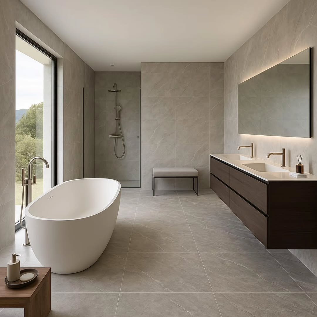 This bathroom leans into simplicity—and nails it. Large-format tiles, a sleek freestanding tub, and a floating double vanity create a space that feels expansive and uncluttered. It’s minimal, but not empty.