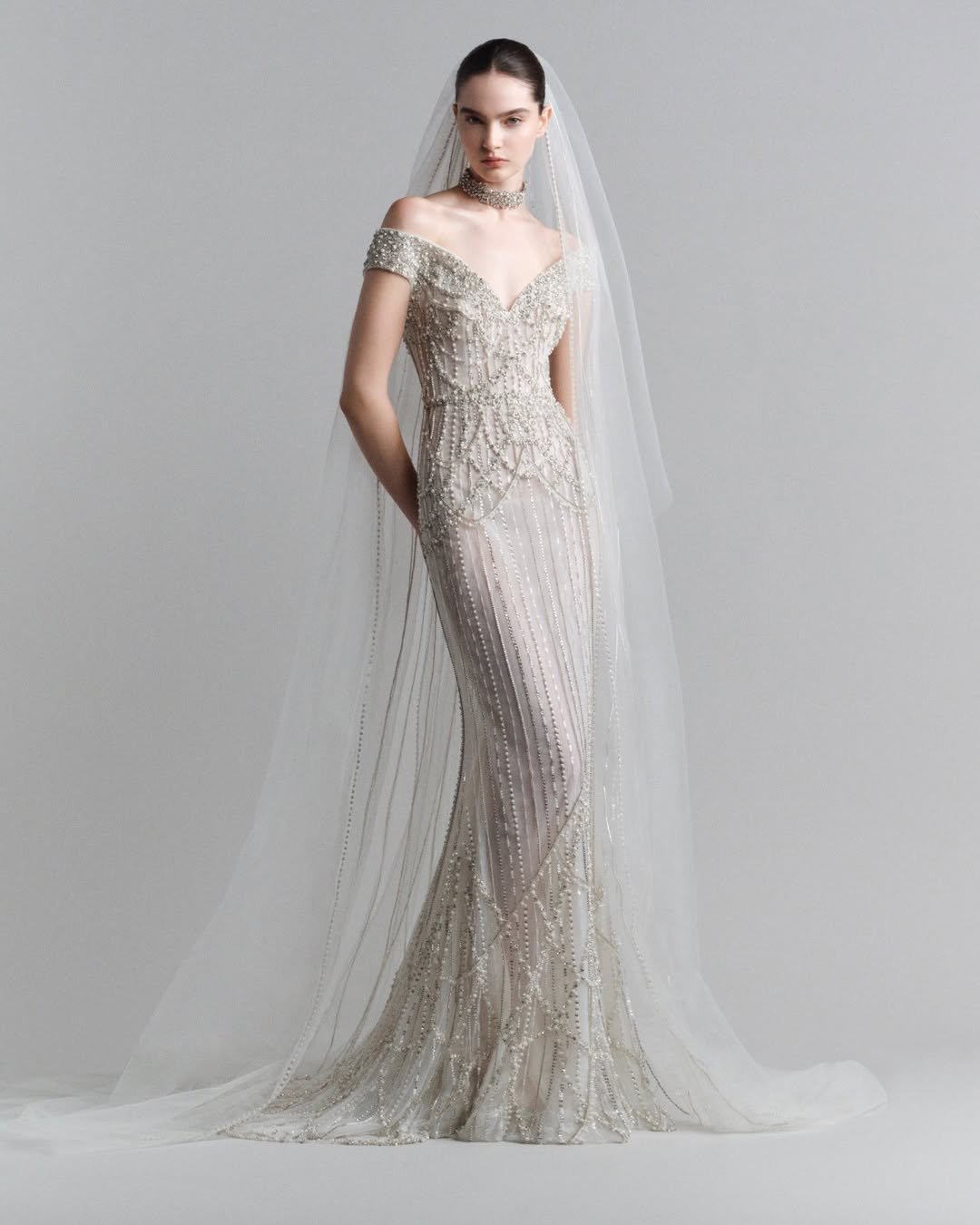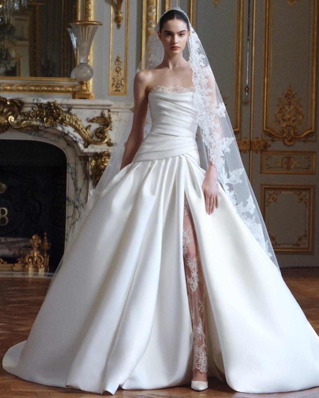 It’s the kind of bridal look that doesn’t rely on excess. Clean lines, soft sheen, and a cathedral-length veil that moves like air. Elegant, composed, and entirely unforgettable in the most understated way.
