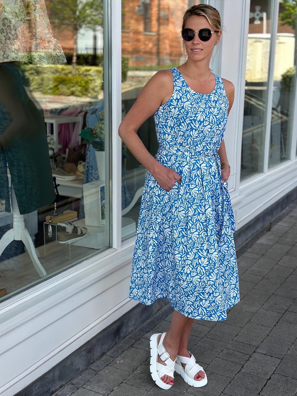 There’s something refreshing about this blue and white print. The sleeveless cut and cinched waist create a shape that feels both structured and relaxed, perfect for everyday wear.