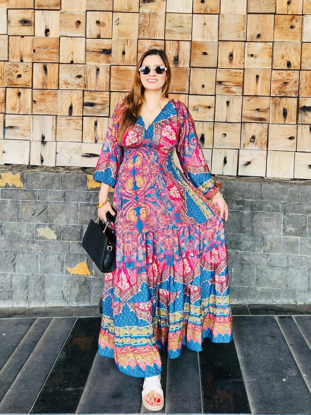 There’s a carefree rhythm to it. Paired with simple slides and a structured bag, it becomes that perfect balance of bold and effortless, like a weekend that doesn’t follow a plan.