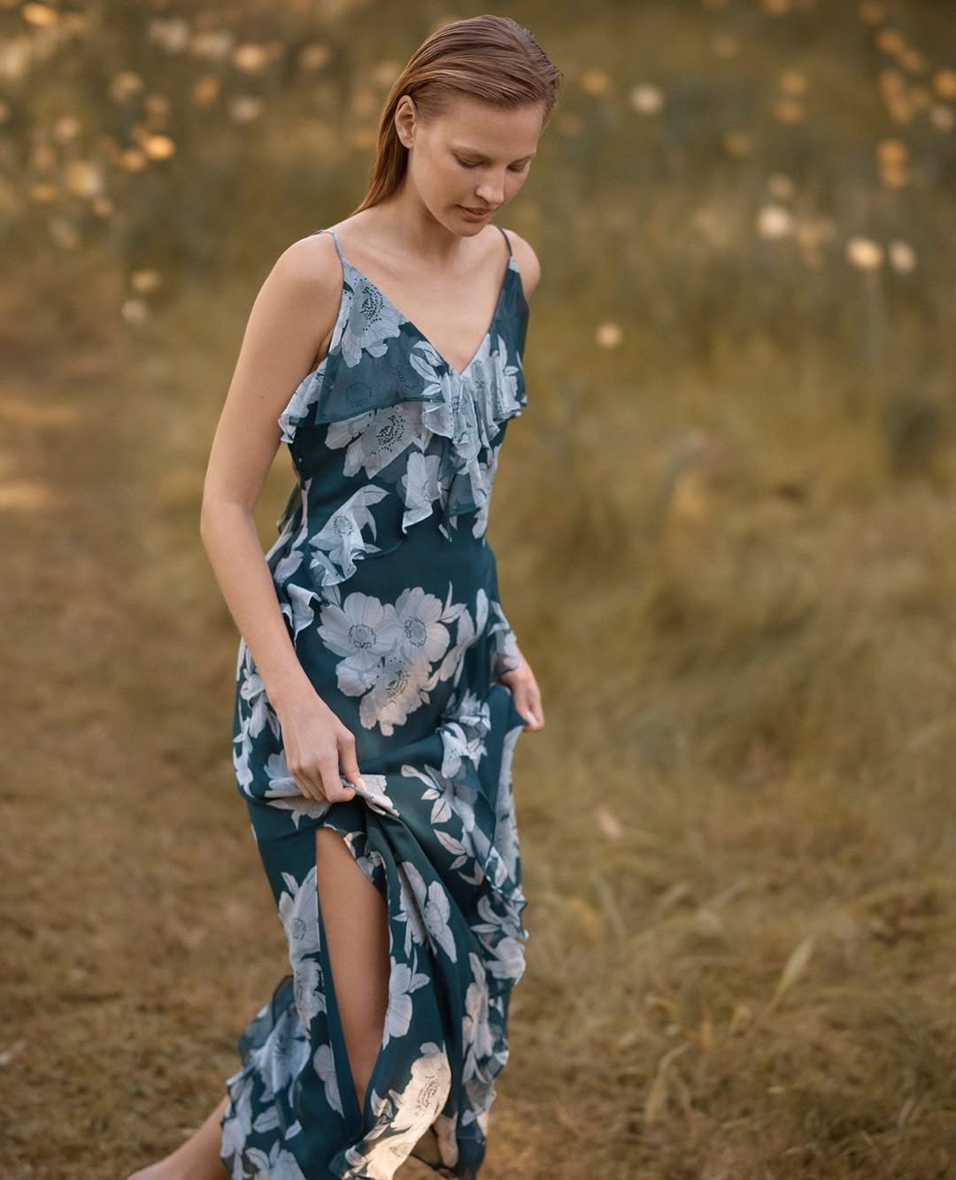 A deep-toned floral slip dress brings a moodier take on summer dressing. The soft ruffles and fluid fabric add movement, while the darker palette keeps it grounded.