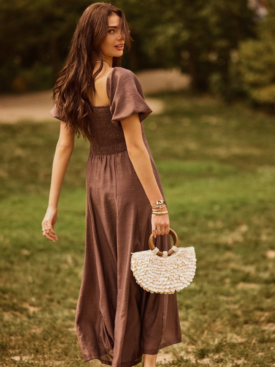 This warm brown dress carries a softness that feels almost nostalgic. The smocked bodice hugs just enough, while the puff sleeves and flowing skirt bring movement without feeling fussy.