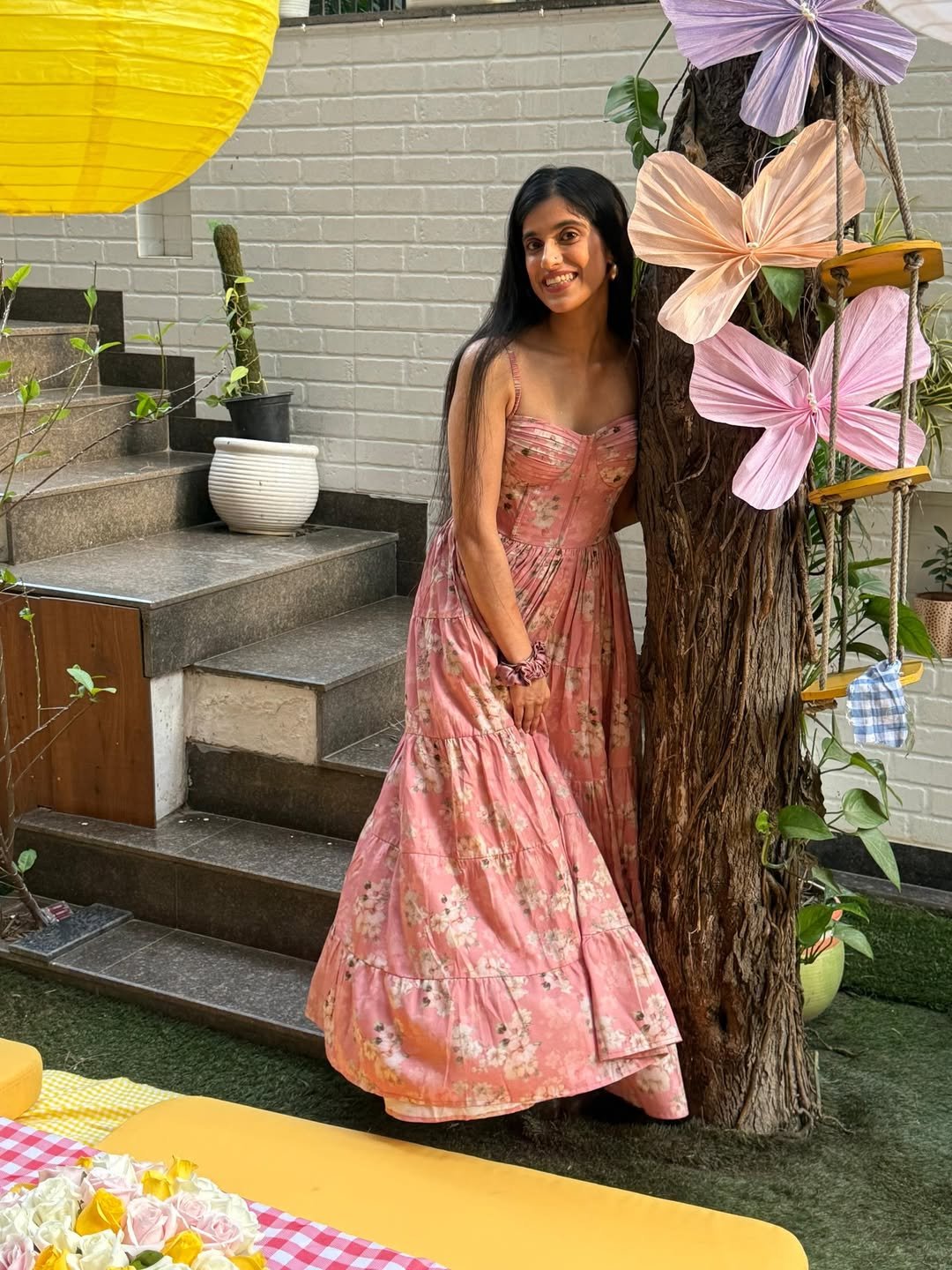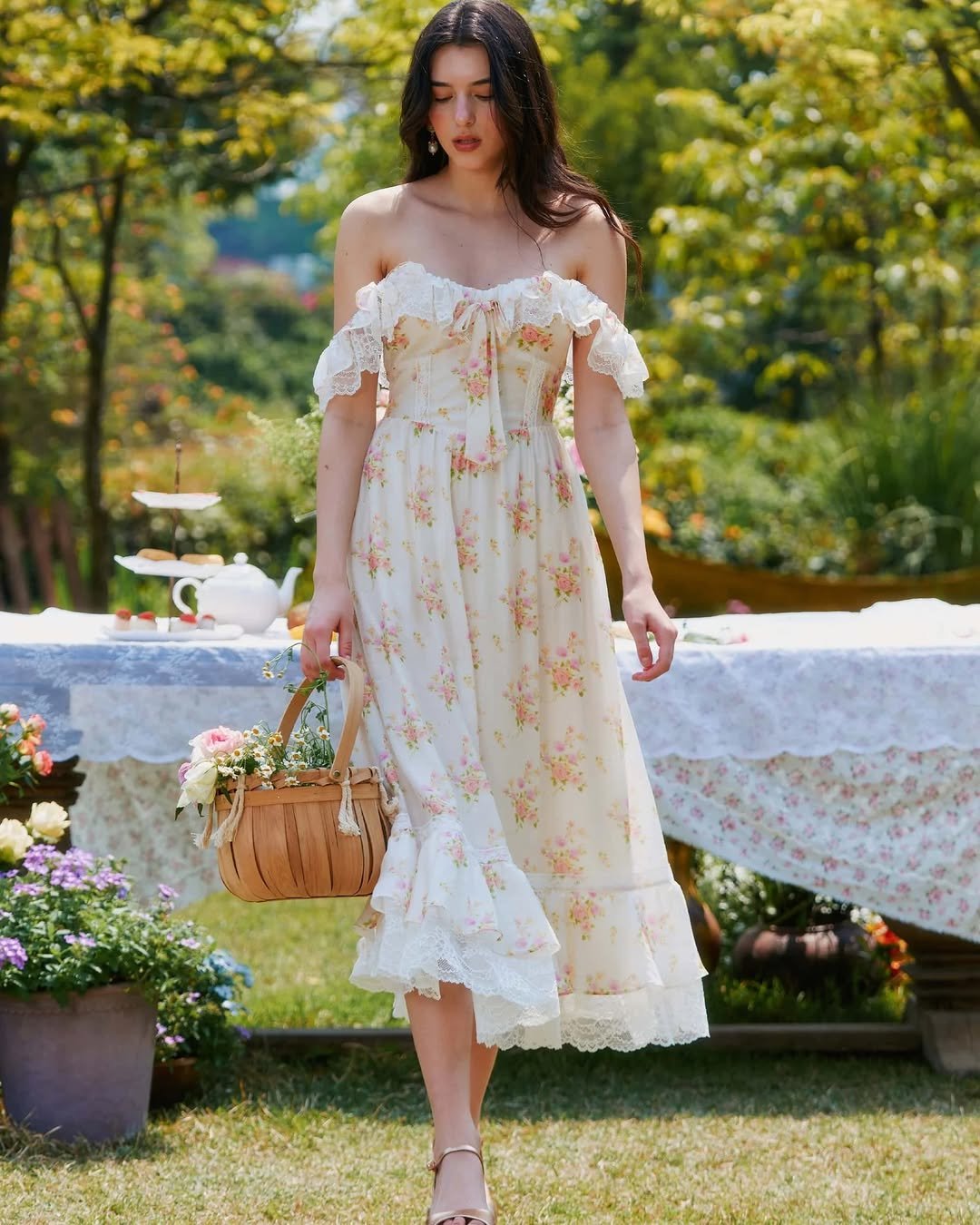 This one leans fully into that garden party mood. The fitted bodice flows into tiered layers that move with every step, catching light and air in the prettiest way.