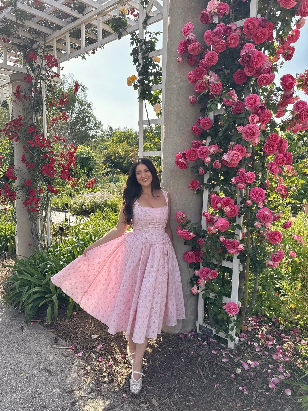Surrounded by blooming roses, this pink midi feels like it belongs to the setting. The fitted bodice and full skirt create a gentle shape that moves with ease, catching light with every step.